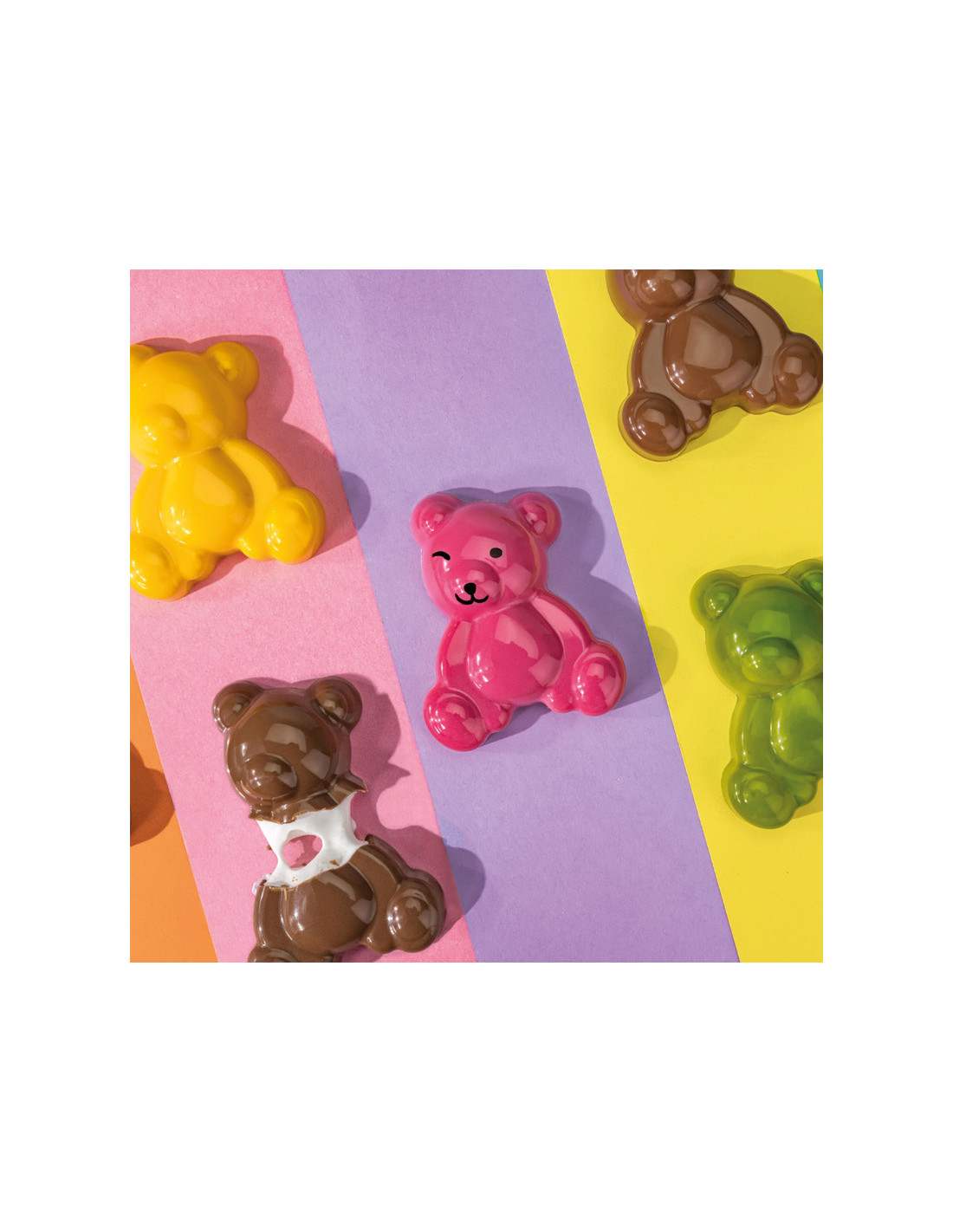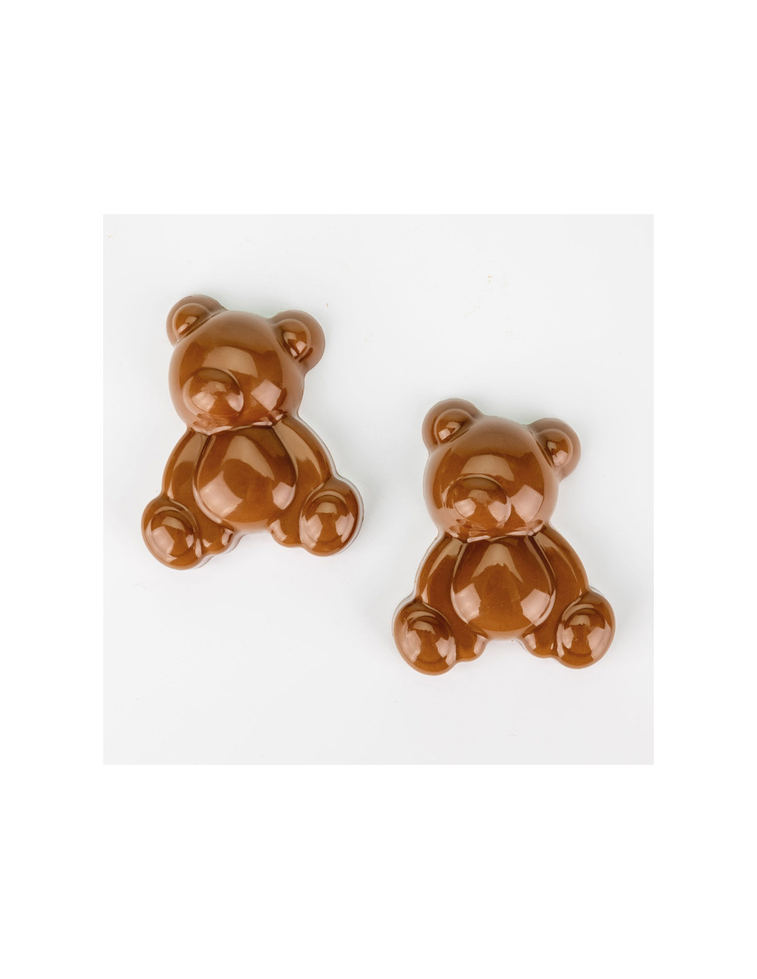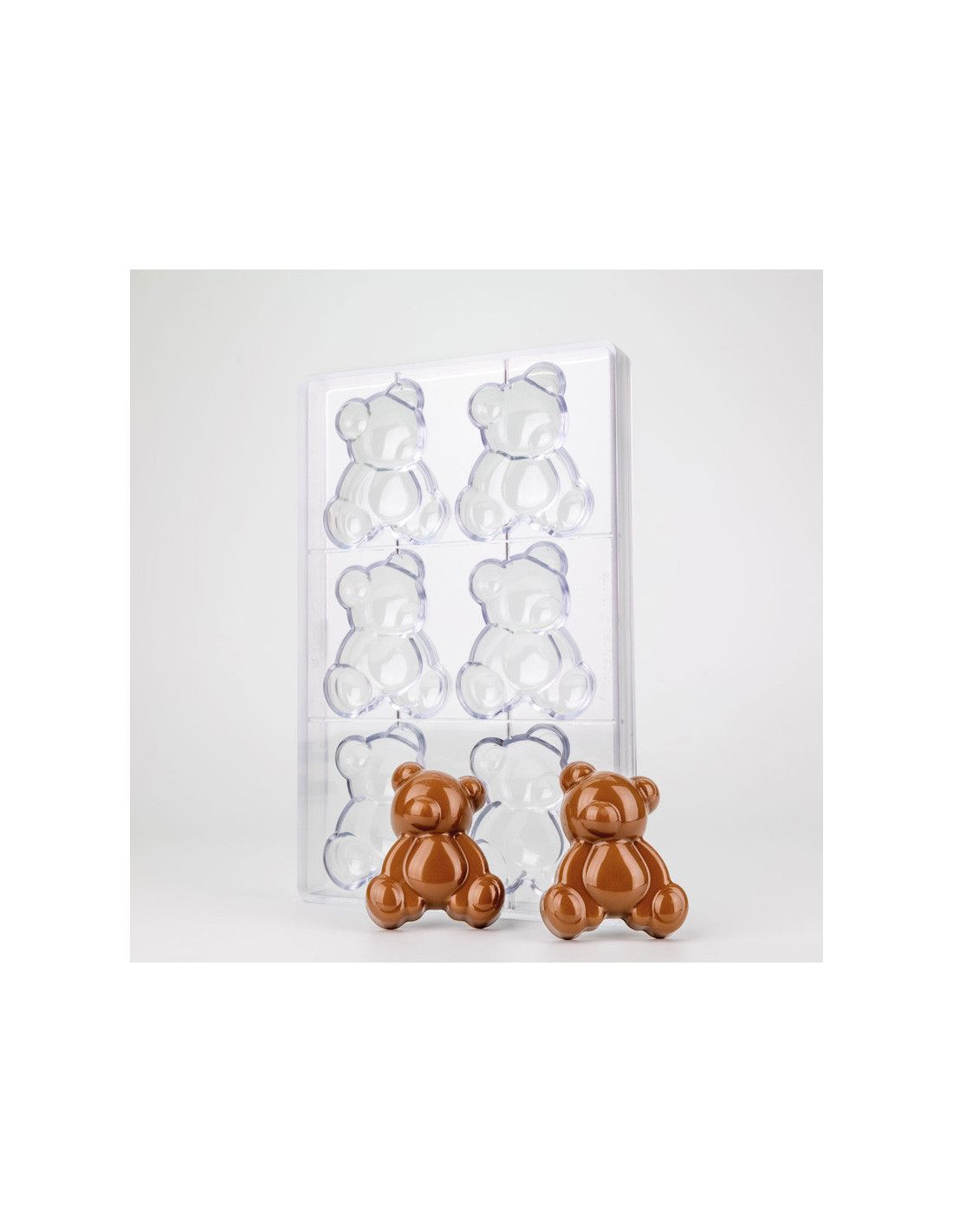 Molde de policarbonato para figuras de chocolate con forma de osito, con 6 cavidades, tamaño de 80 x 64,5 x h22,5 mm y un peso aproximado final de 56 g por pieza.