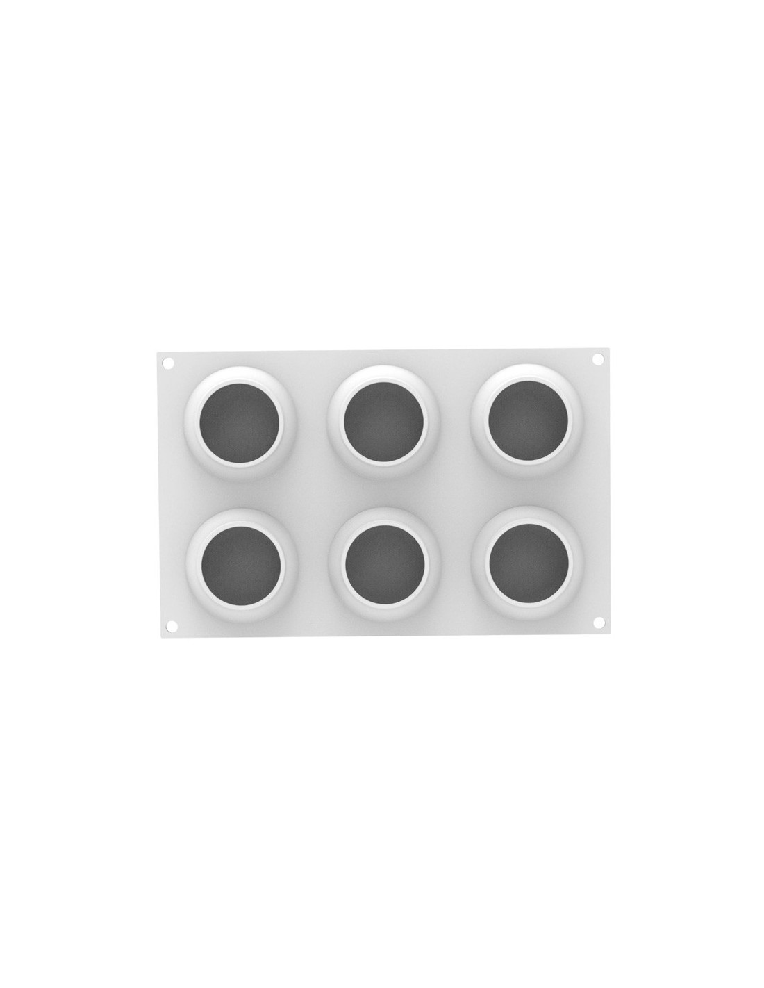 Fabricado en silicona alimentaria flexible y resistente, garantiza un desmoldeo perfecto y uniforme sin dañar la estructura del postre. El molde cuenta con 6 cavidades, permitiendo producir varias unidades de manera eficiente. Es apto para horno, congelador y abatidor, ofreciendo gran versatilidad en la preparación de postres fríos o calientes.