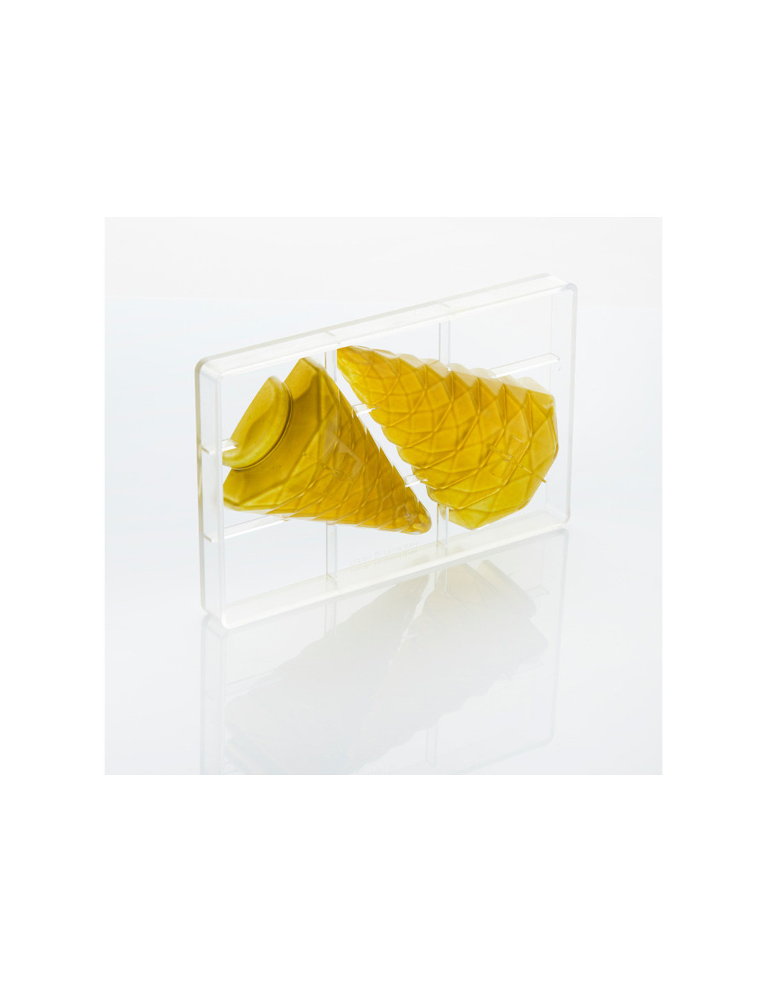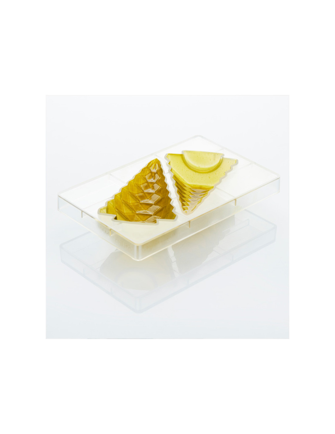 Fabricado en policarbonato transparente de alta calidad, garantiza rigidez, brillo y desmolde perfecto, permitiendo obtener un árbol completamente definido en todas sus aristas y facetas. La cavidad está diseñada para trabajar con diferentes técnicas: chocolate macizo, capas, rellenos o decoraciones aerografiadas.