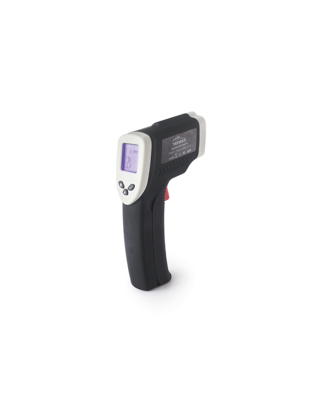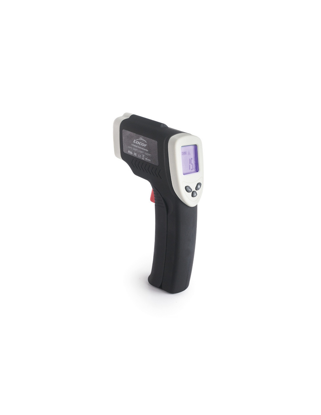 Termómetro infrarrojo con láser, diseñado para medir temperaturas sin contacto con rapidez y precisión. Rango de –50 ºC a 550 ºC.