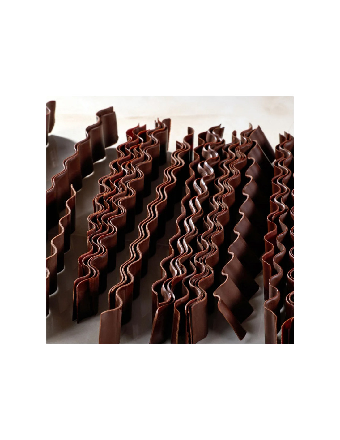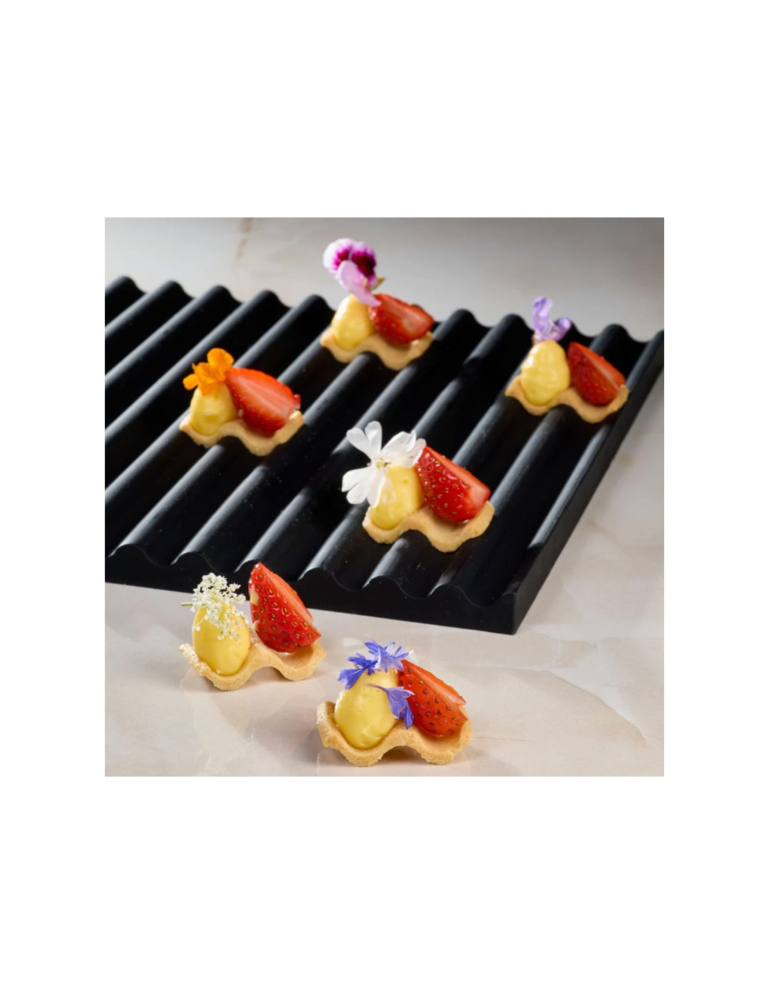 Fabricado en silicona alimentaria de alta calidad, el kit garantiza una definición precisa del relieve, resistencia al uso intensivo y un desmoldeo sencillo, incluso en masas delicadas. Su diseño de ondas redondeadas aporta volumen visual sin agresividad, logrando un resultado elegante que encaja tanto en pastelería clásica reinterpretada como en propuestas contemporáneas.
