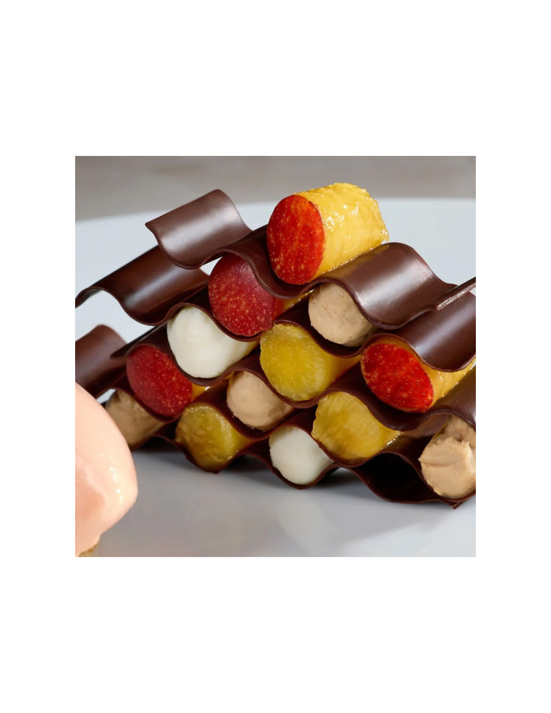 El Kit Onda GG080 es un set profesional de moldes de silicona pensado para elevar el acabado estético de elaboraciones de hojaldre, masas laminadas y pastelería creativa. Diseñado en colaboración con el chef Paolo Griffa, este kit permite reproducir un dibujo ondulado suave y armónico, ideal para presentaciones modernas y refinadas.