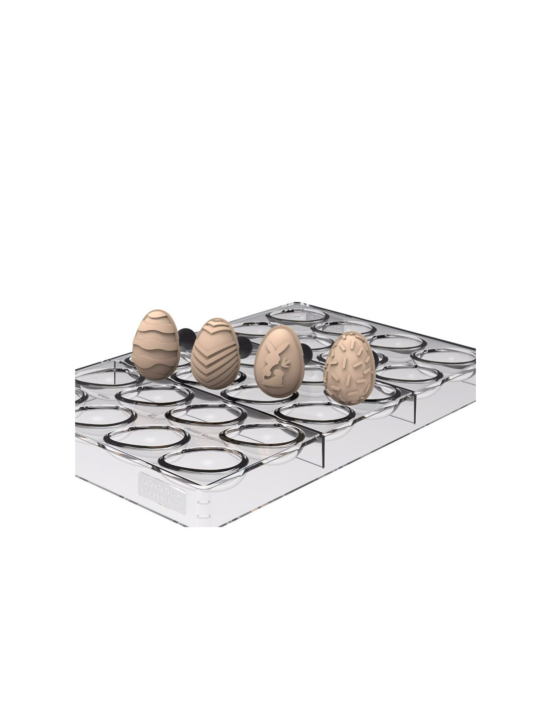 Set profesional Choco Stamp E + Molde de Tritan para crear 24 bombones de chocolate con forma de huevo, con decoración precisa y repetible. Ideal para producciones elegantes y personalizadas en campañas de Pascua y chocolatería creativa