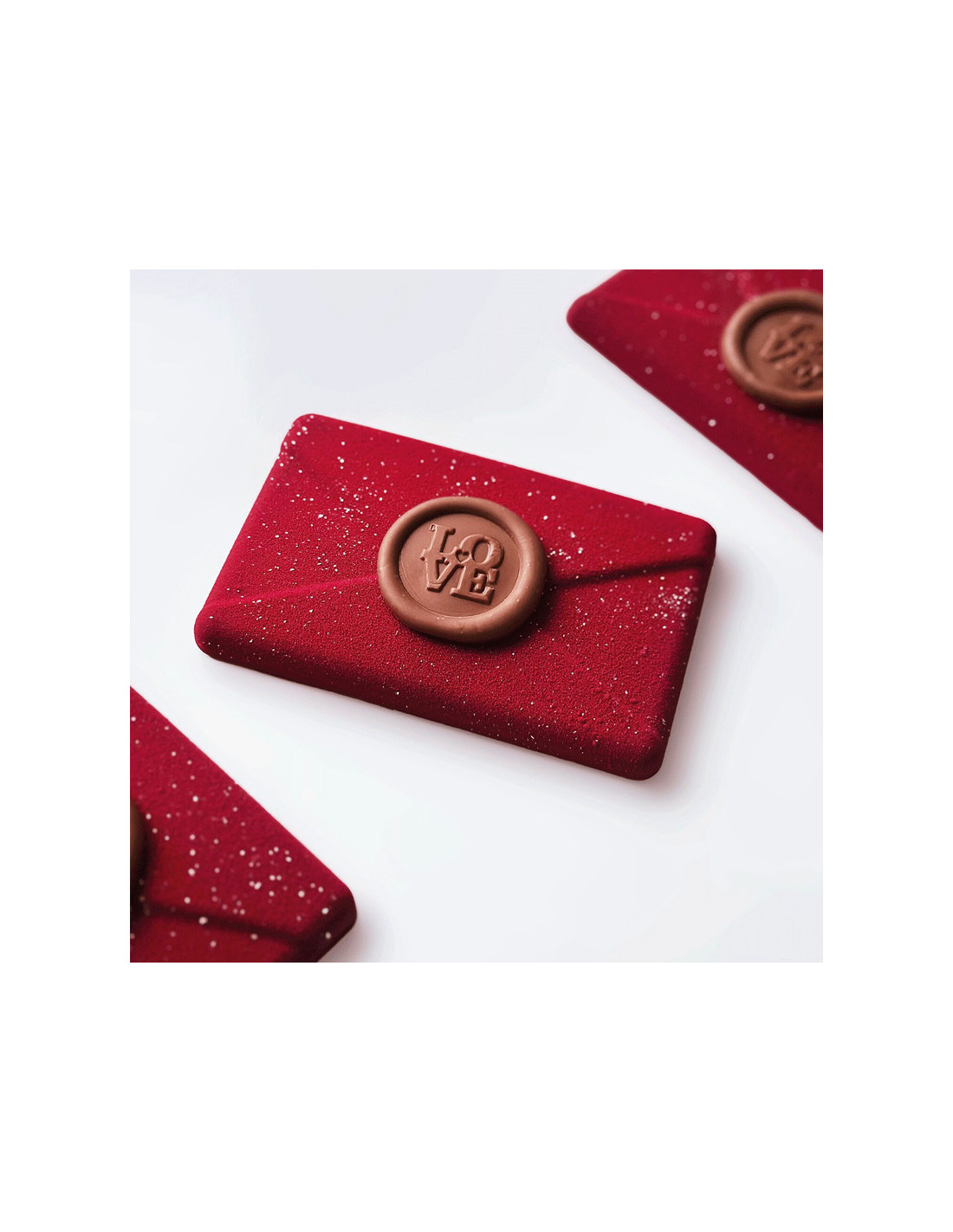 Inspirado en un sobre para cartas, este molde permite realizar una elegante tableta de chocolate con estructura hueca, pensada para contener un mensaje, dedicatoria.