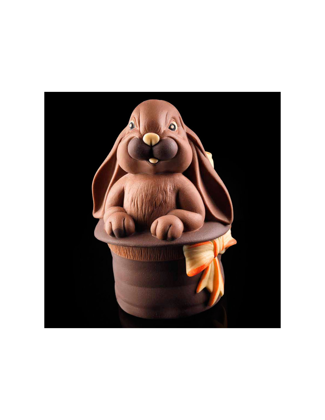 Este original molde profesional de silicona está formado por 2 mitades que crean una figura tridimensional encantadora: un huevo de Pascua del que emerge un conejo con un sombrero de cilindro mágico.