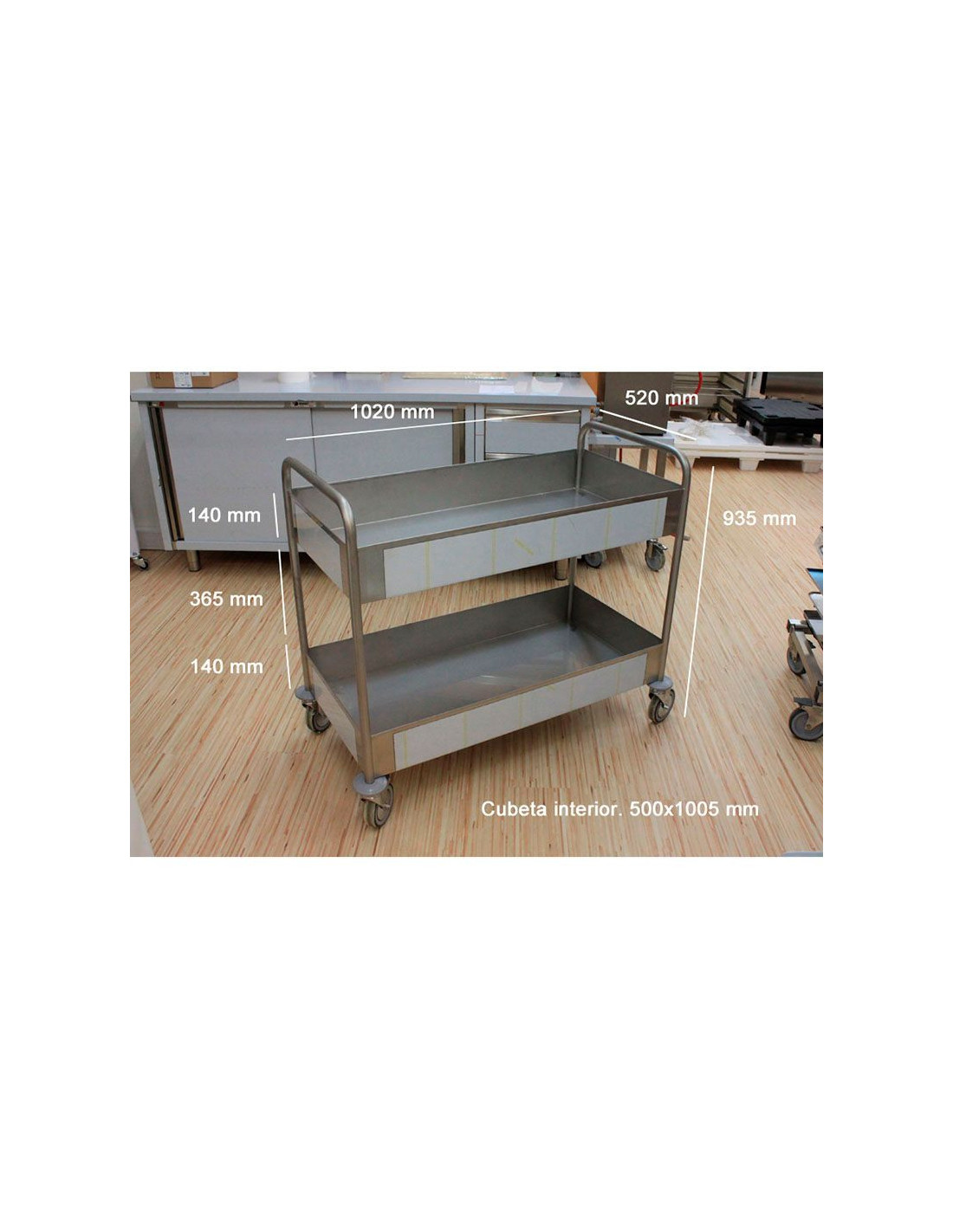Carro de servicio de acero inoxidable con dos cubetas. Medidas: 935 mm x 520 mm x 1020 mm. Cubeta interior: 500 mm x 1005 mm. Alto de la cubeta: 140 mm. Espacio entre cubetas: 365 mm.