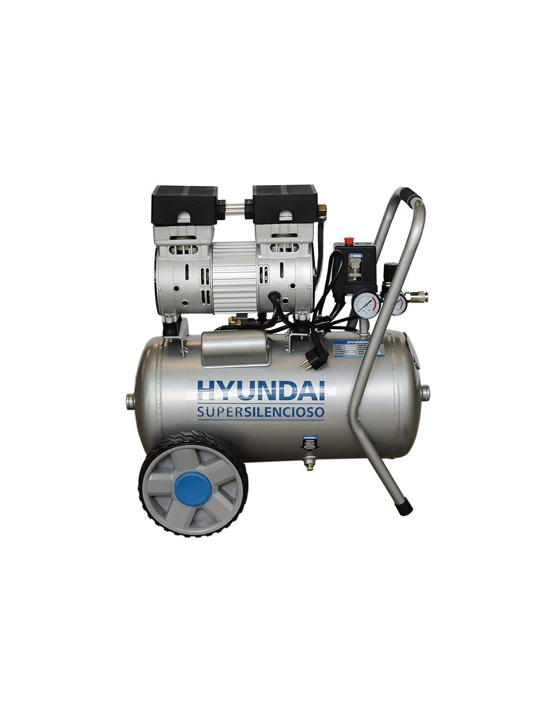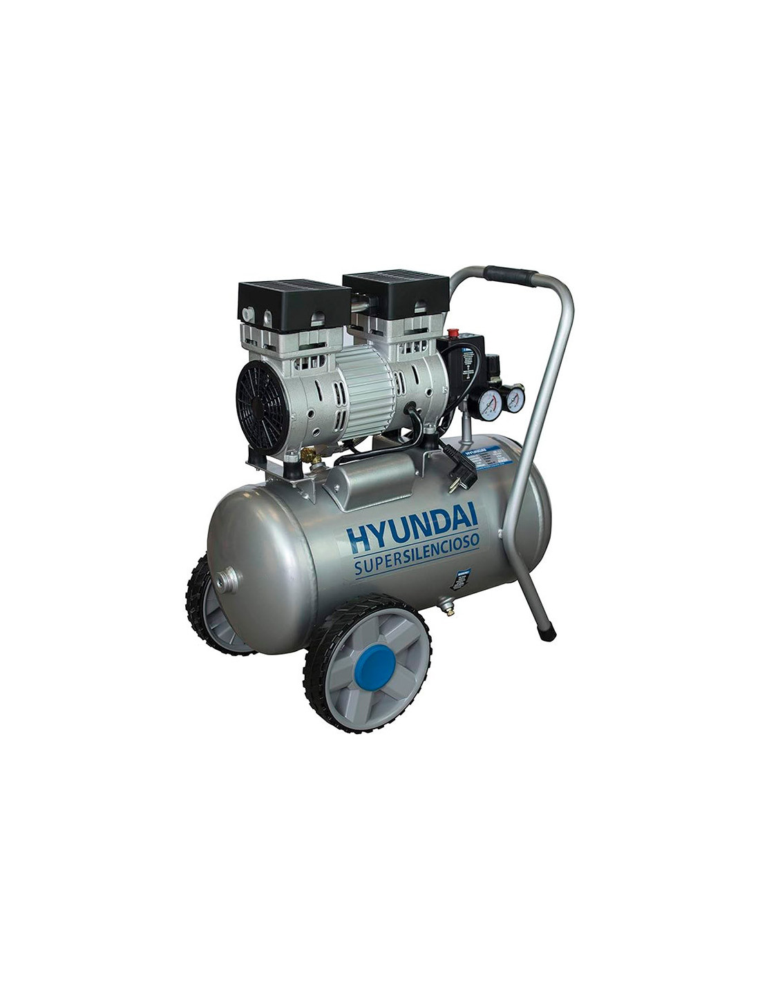 Compresor monofásico silencioso Hyundai HYAC24-1S. Sin mantenimiento, no necesita aceite. Tanque de 24 litros. Potencia de 750w/1.0 HP. Caudal de aire de 125 L/m. Bajo nivel sonoro.