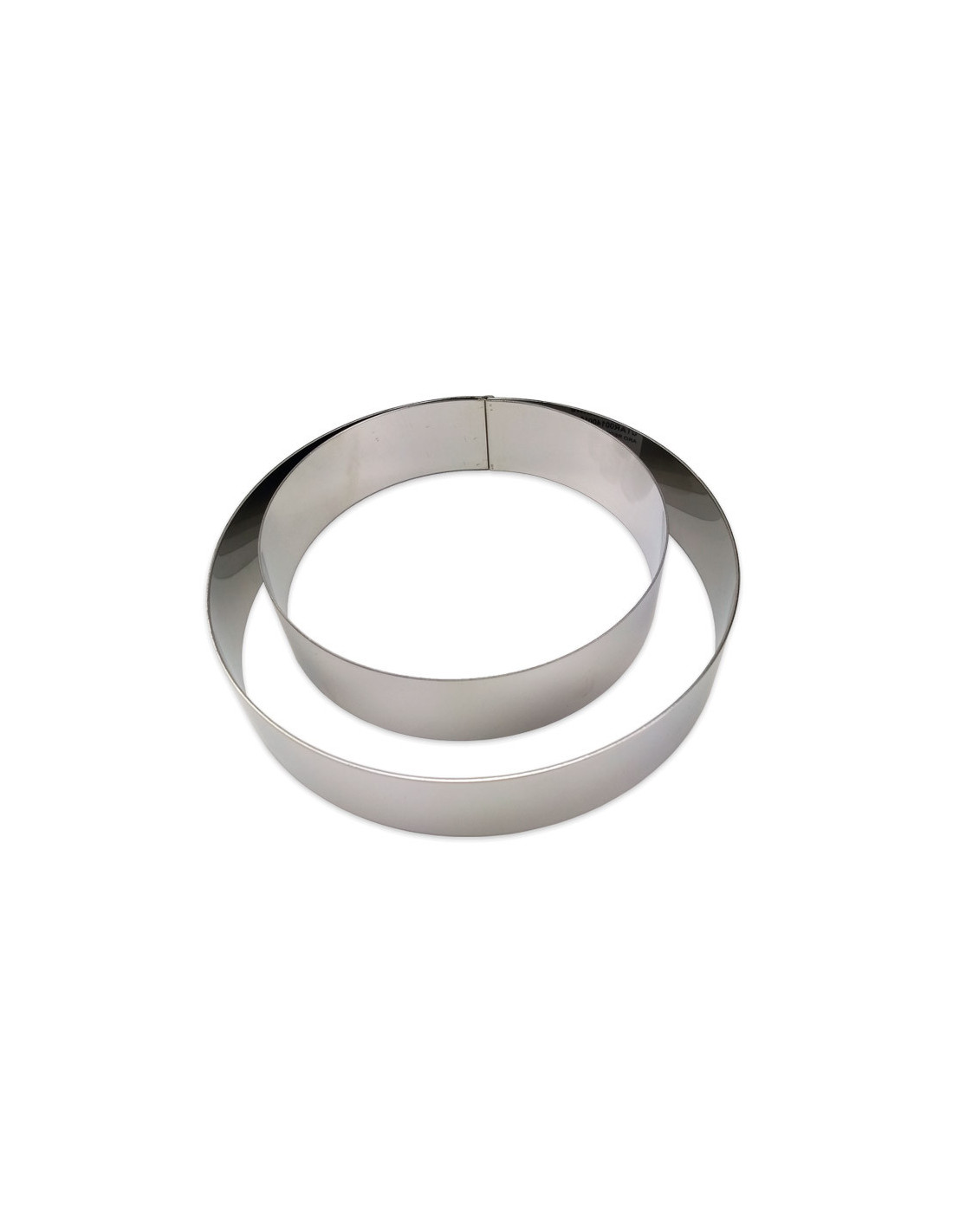Aro redondo de repostería fabricado en acero inoxidable, con una altura fija de 4 cm. Herramienta esencial en pastelería profesional para el montaje, corte y presentación de tartas, bizcochos, mousses y postres fríos o horneados. Su estructura robusta permite obtener bordes limpios y formas perfectamente definidas. Este aro es apto para horno, congelación y lavavajillas, ofreciendo durabilidad y versatilidad en cualquier entorno de cocina o pastelería.