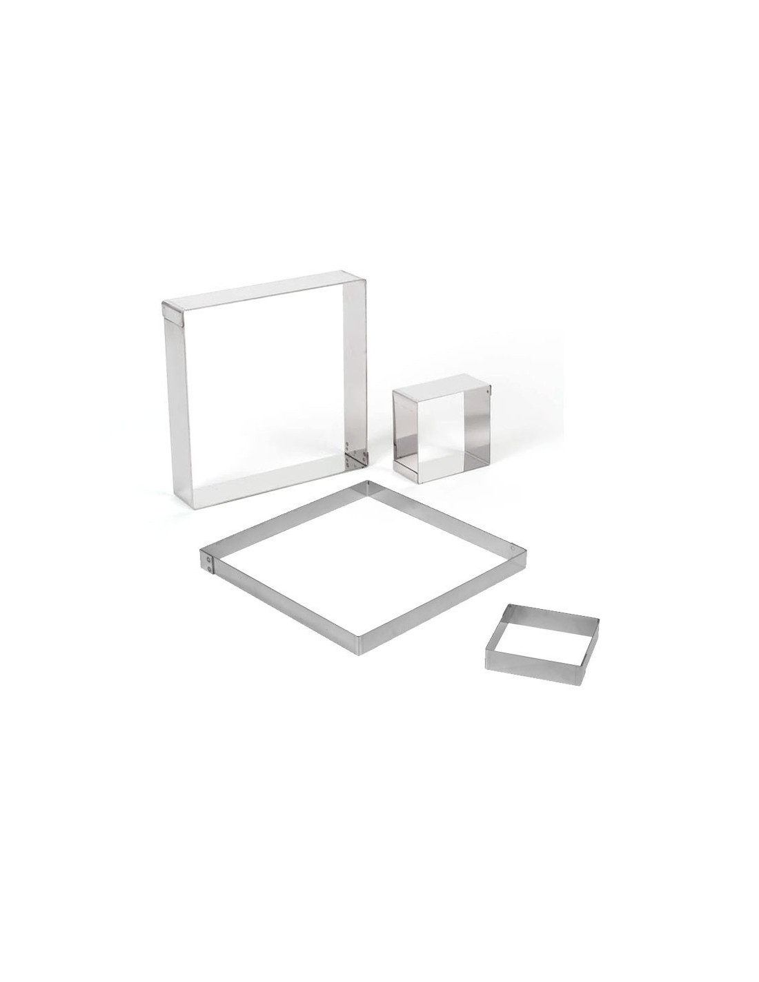 Marco cuadrado inox de 4 cm de alto, disponible en varias medidas. Ideal para montar y presentar postres con forma definida.
