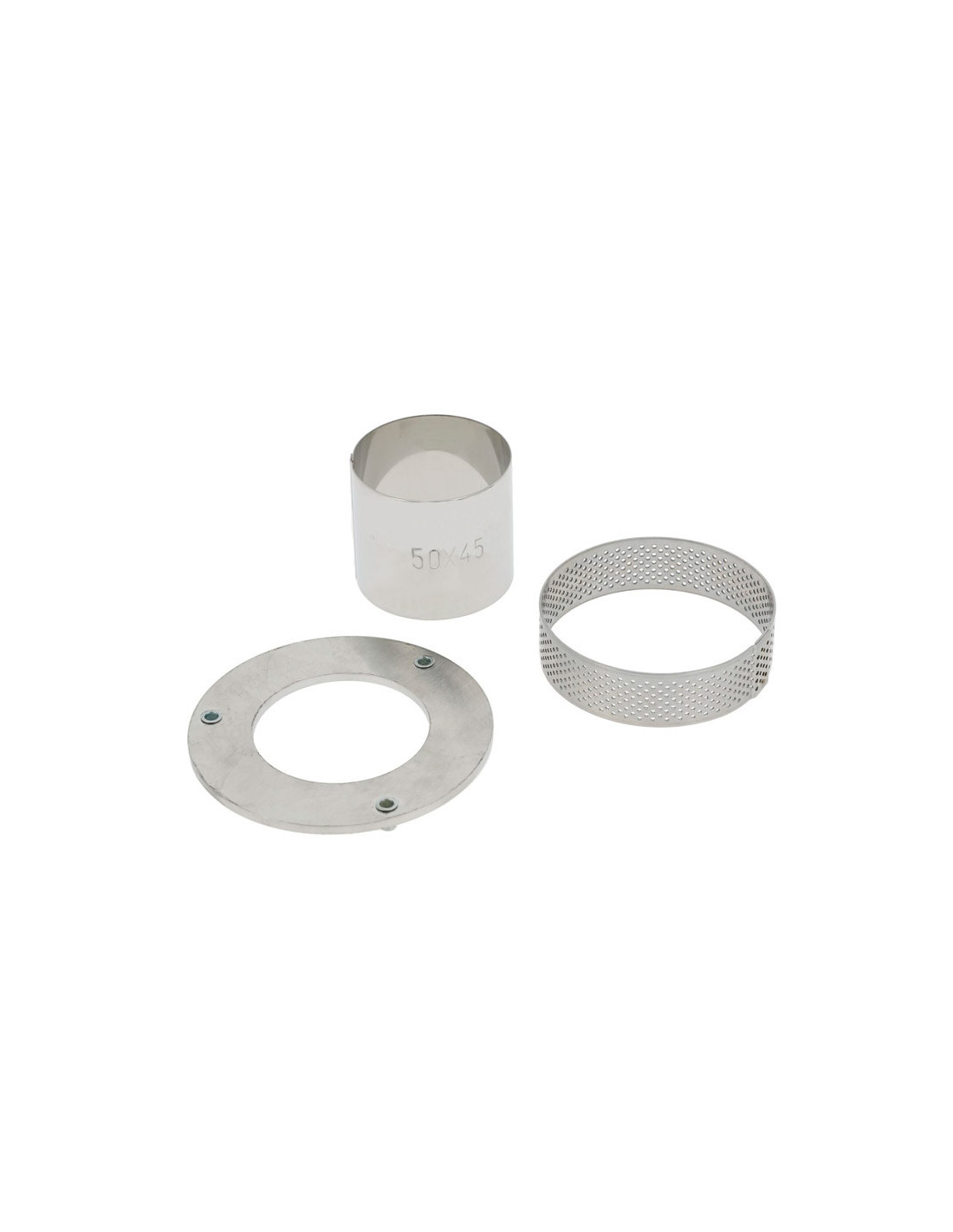 Anillo para hojaldrados bajo de acero inoxidable. El kit se compone de un aro de 50x45mm, un anillo perforado de 70xh20mm y un disco de fijación.