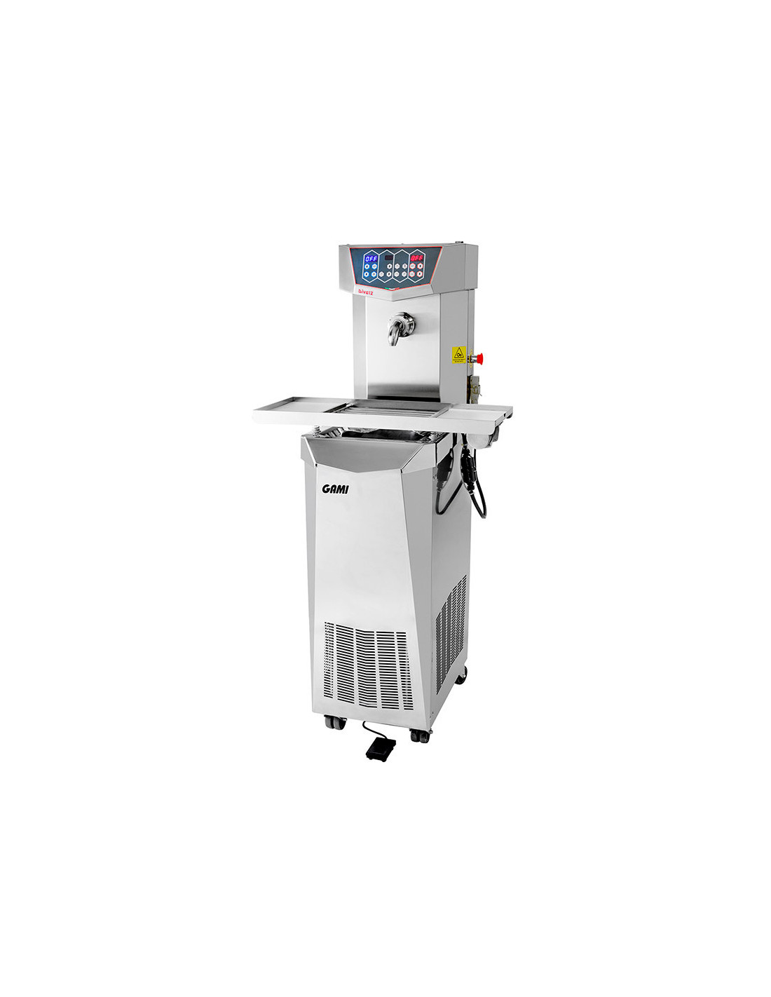 Incluye mesa vibratoria calefactada y pedal de corte de flujo para dosificación controlada. El caudal de chocolate es regulable.