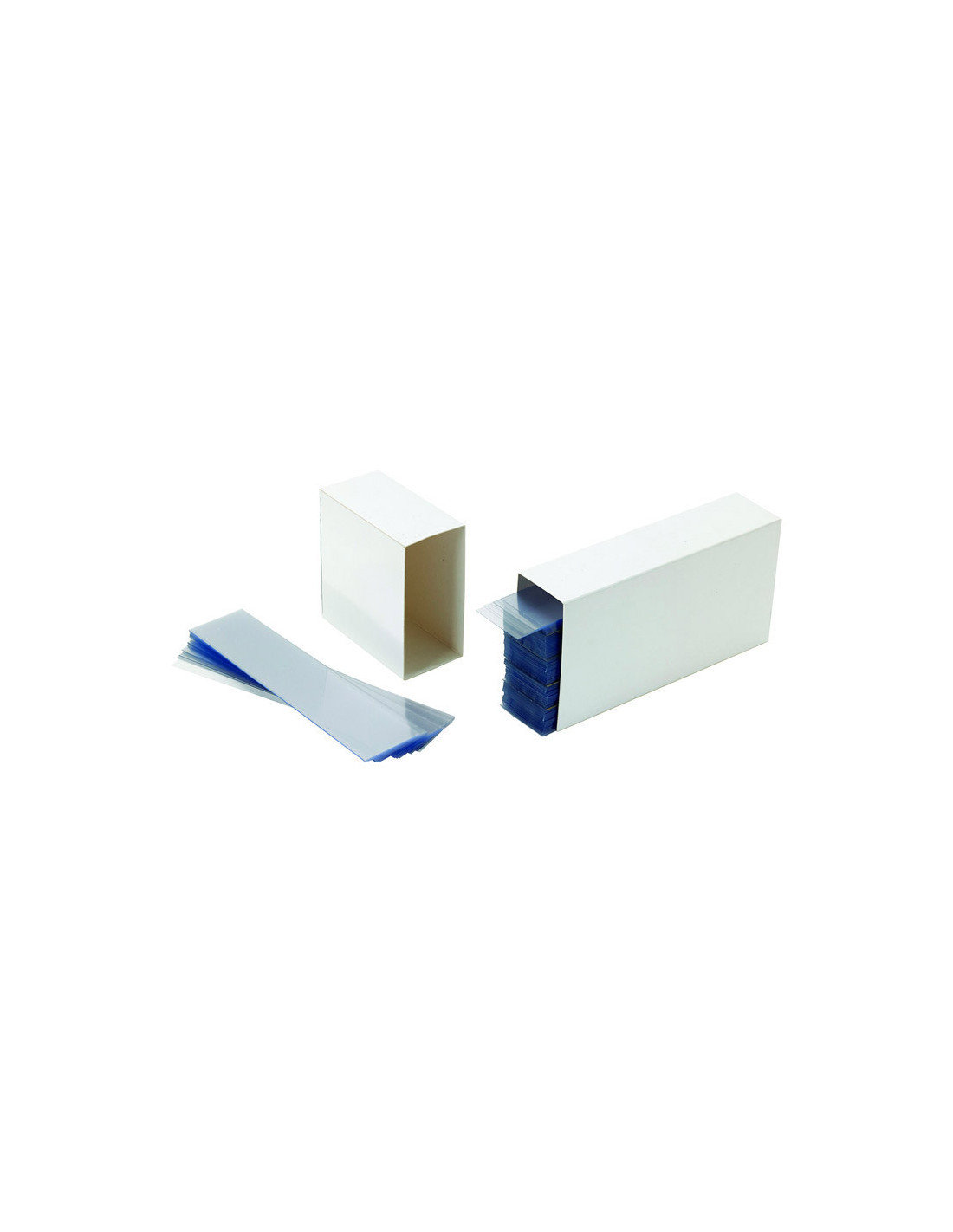 Cinta de PVC incolora precortada. Medidas: 220 x 40 mm, grosor 100 micras. Pack de 1000 unidades en caja de cartoncillo blanco.
