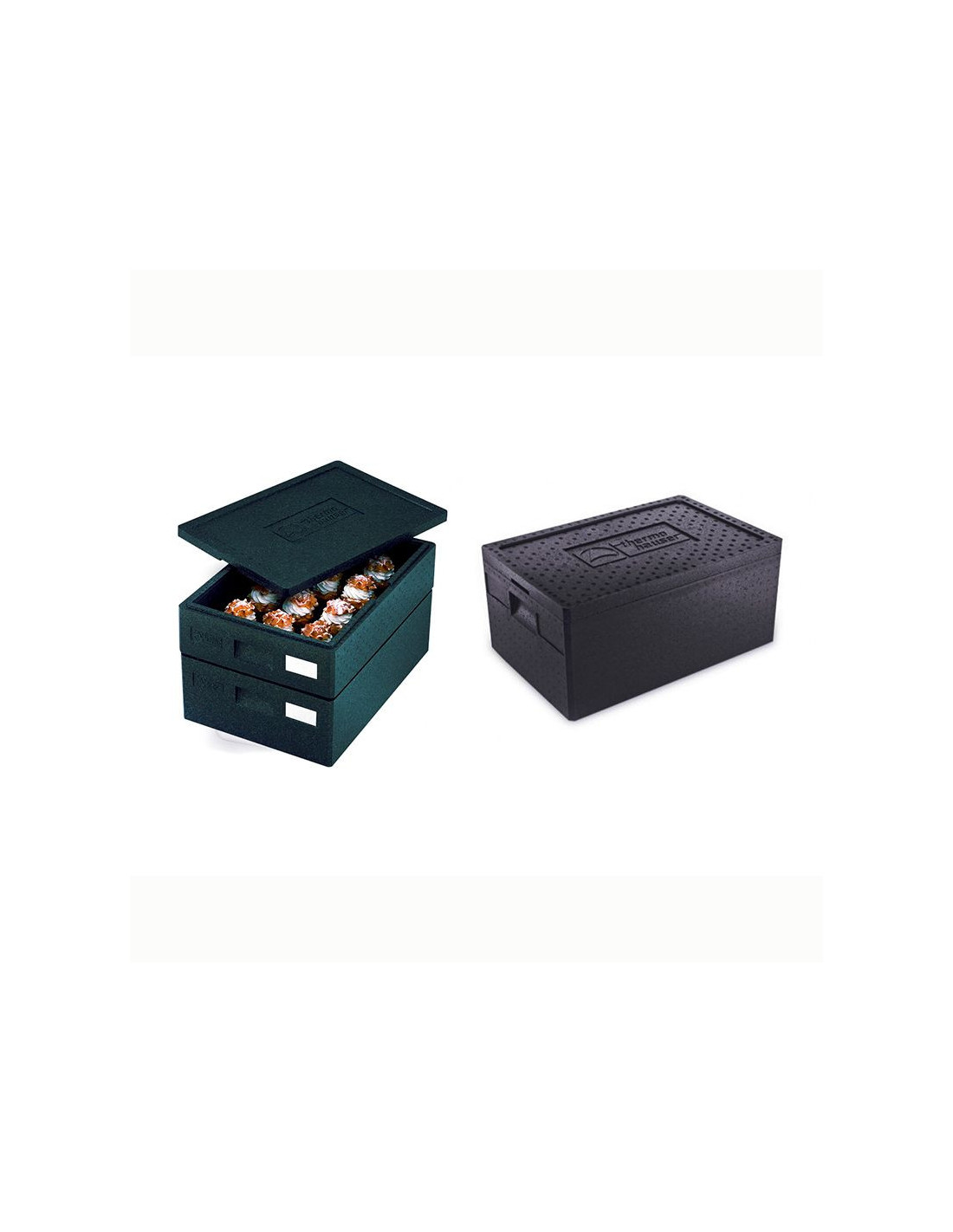 Contenedor isotérmico apilable para el transporte y conservación de temperatura de alimentos de la firma Thermohauser. Exterior: 68,5 cm x 48,5 cm x 14,5 cm. Interior: 62,5 cm x 42,5 x 12 cm.