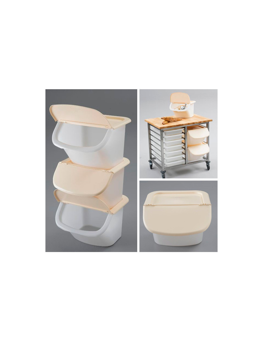 Contenedor de polietileno con ruedas y tapa para ingredientes. Medidas: 55 cm x 75 cm x 71 cm. Capacidad: 140 lt.