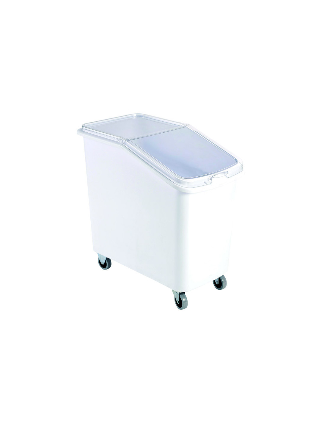 Contenedor de plástico rectangular con tapa y ruedas para ingredientes. Medidas: 75 cm x 40 cm x 71 cm. Capacidad: 120 lt.