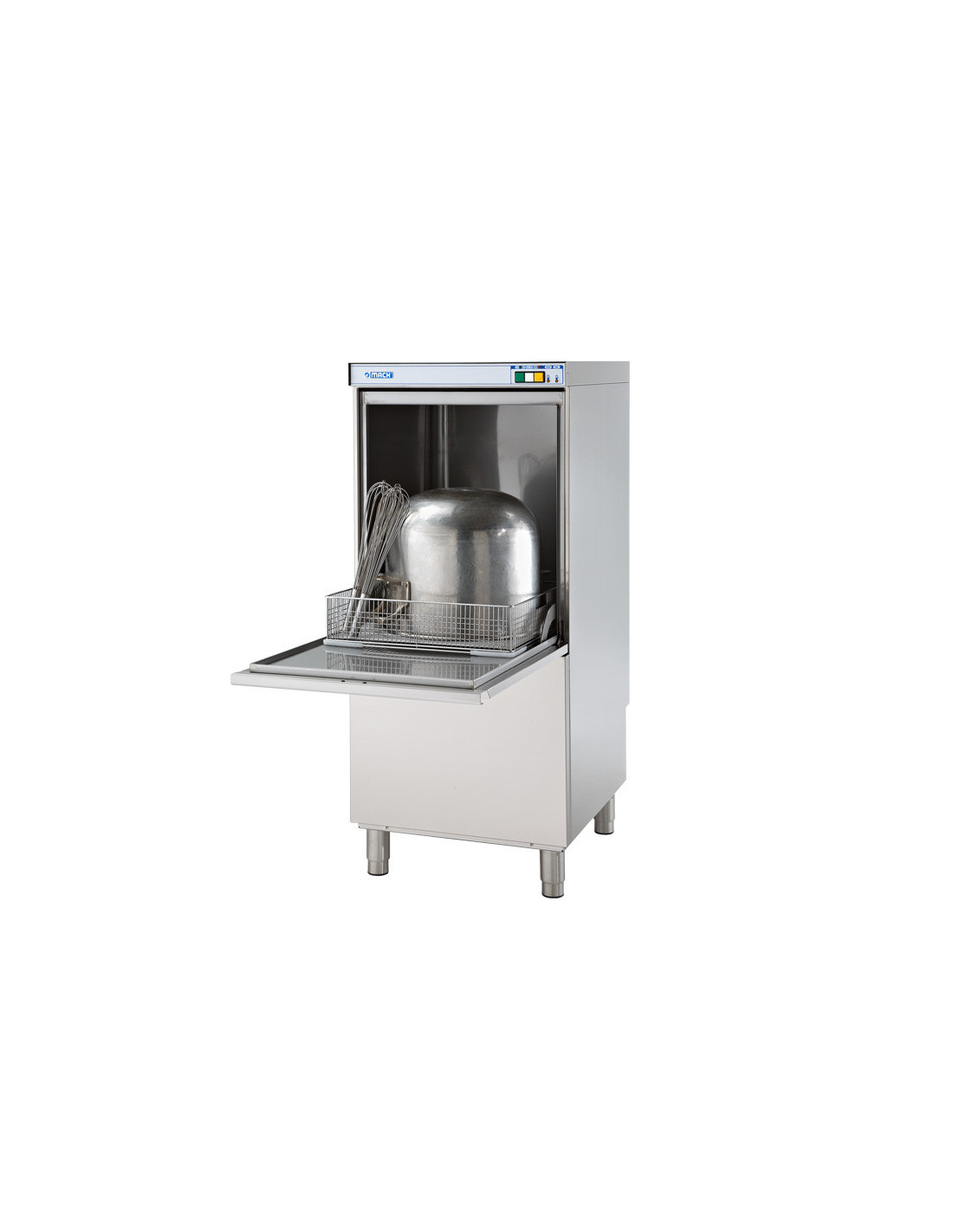 Máquina de alto desempeño construida con características de fiabilidad y robustez: brazos de lavado y enjuague, tuberías, caldera, filtros, todo en acero inoxidable AISI 304. Acabado externo SCOTCH-BRITE. Máquina lavaobjetos aconsejada para el lavado de utensilios de repostería, heladería y gastronomía.