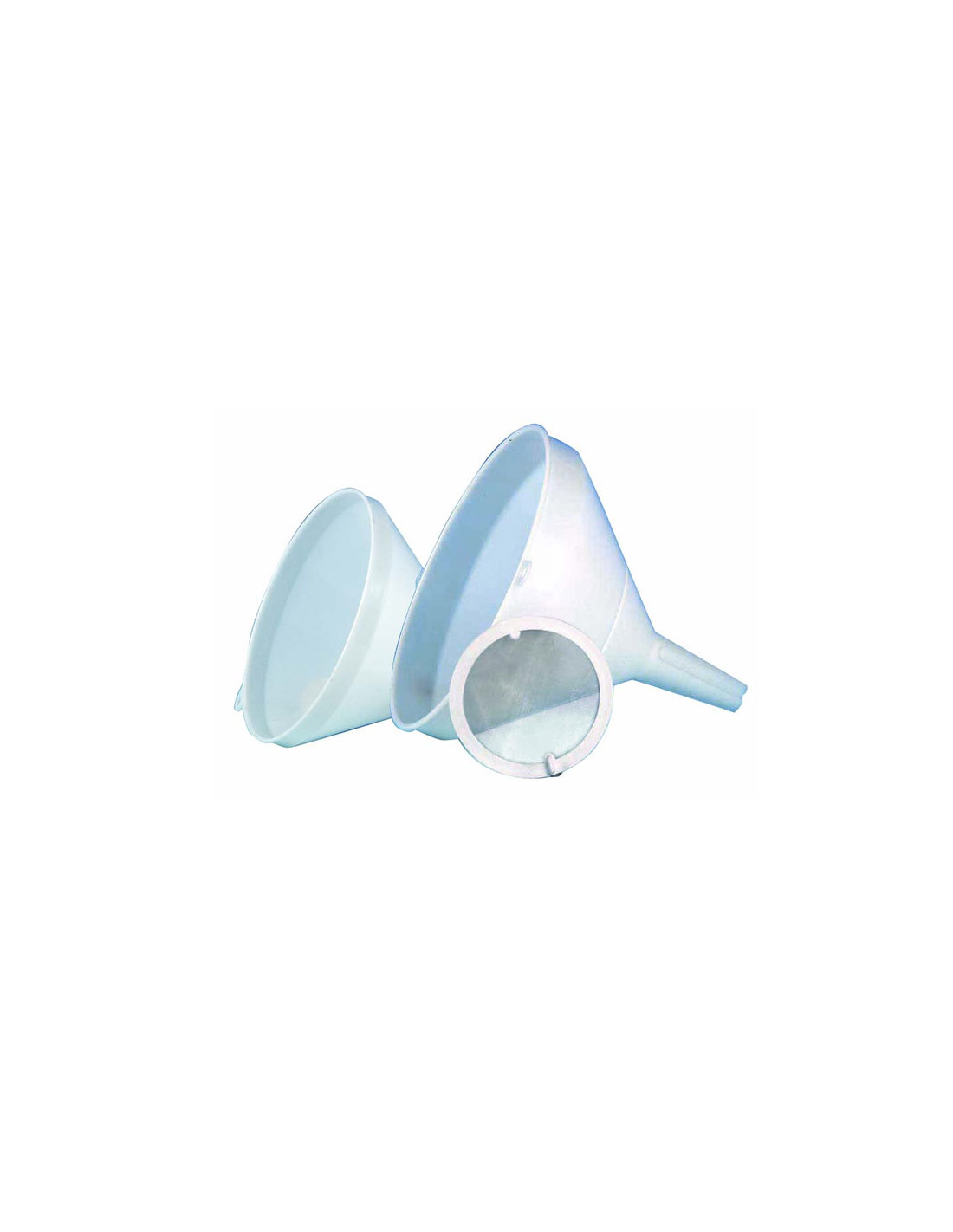 Embudo con filtro fabricado en plástico, diseñado para el trasvase de líquidos y productos de forma limpia y controlada.