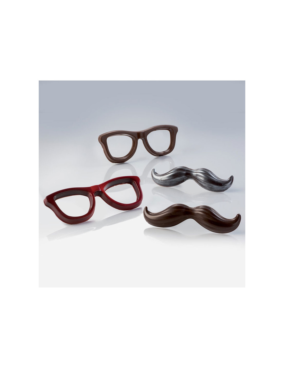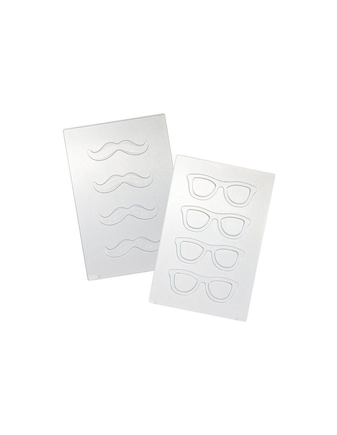 Molde de PVC para la creación de figuras de chocolate. Incluye moldes para las formas Bigote y Montura de gafas.