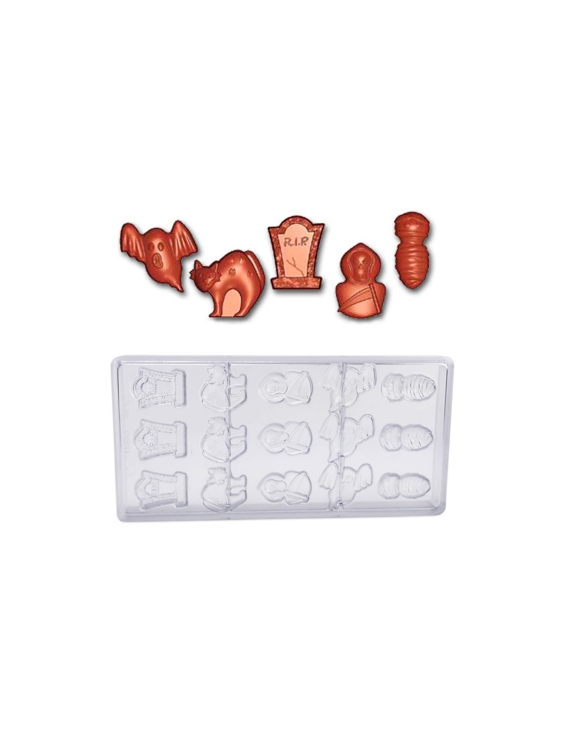 Molde de PVC ARDI567 para realizar cuatro formas distintas de lápidas de chocolate. Medidas: 40 x 65 x 10 mm. 6 cavidades.
