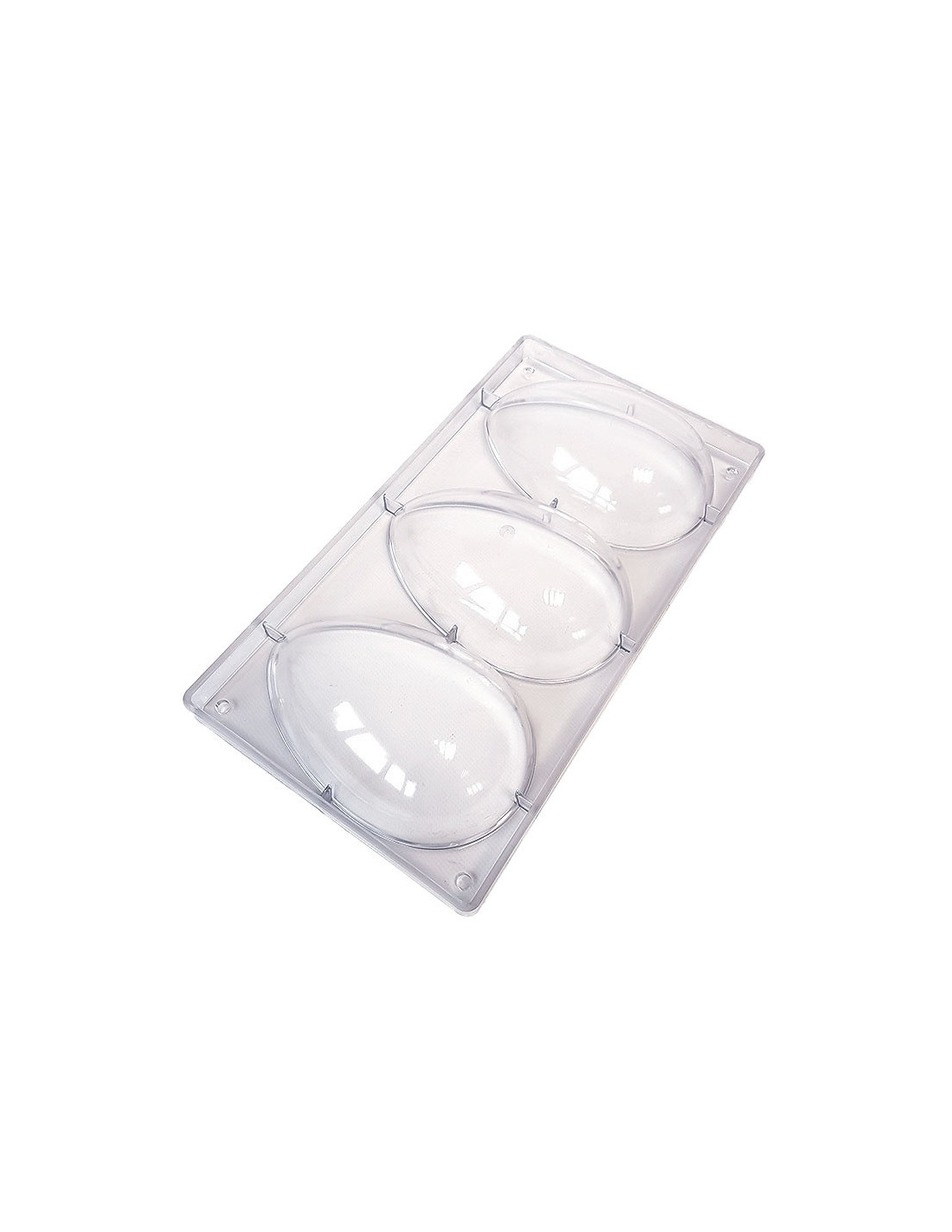 Molde de policarbonato de medidas 365x295mm para la realización de 3 medios huevos de 170mm de altura y 108mm de anchura de 200 gramos aproximadamente de chocolate. Este molde permite hacer un 3 huevos enteros de una sola vez al acoplarse con otro de la misma referencia. Para la sujección de los moldes se precisan las grapas transparentes ref. UTPO62603002. Se suministra también con los anclajes para máquina rotativa.
