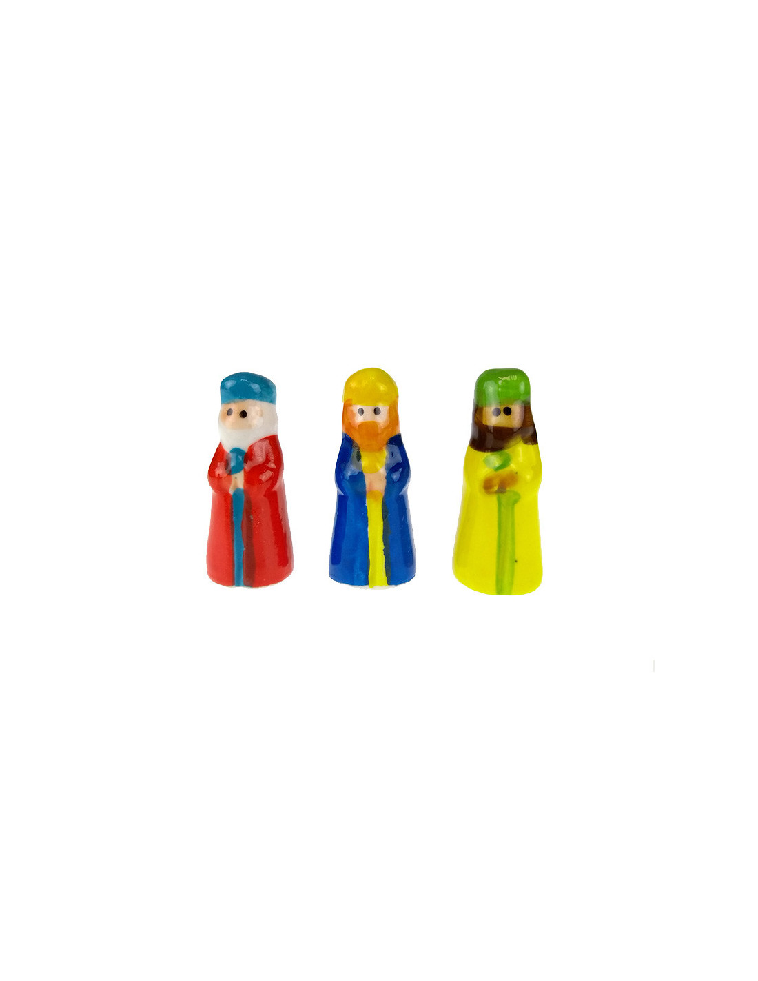 Figuritas de Reyes Magos en cerámica, tamaño 35 x 15 mm, presentadas en pack de 100 unidades. Ideales para roscones y campañas de Reyes.