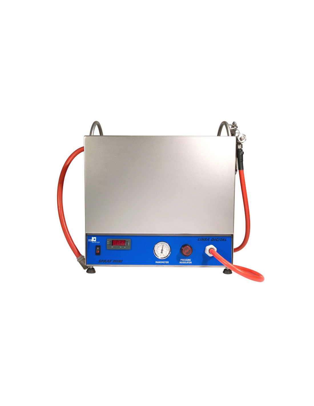 Un regulador permite trabajar a la presión requerida y el termostato permite regular la temperatura de trabajo.
