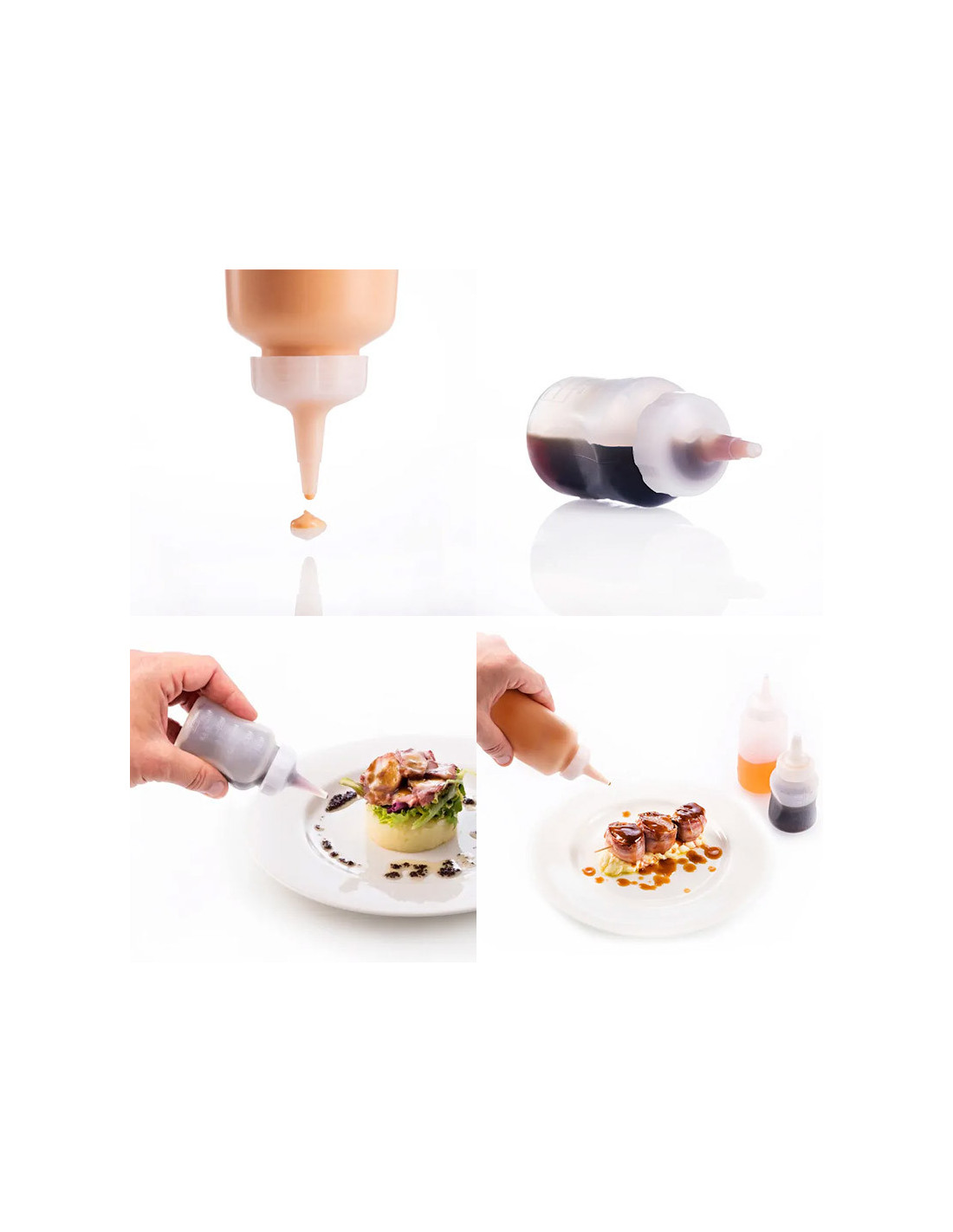 Solución reutilizable para el tratamiento de salsas concentradas o de un mayor coste con dosis mas reducidas. Dosifican la cantidad justa y precisa en el emplatado de las elaboraciones. Precisión y rosca fiable con cierre rápido. Fácil llenado y limpieza.