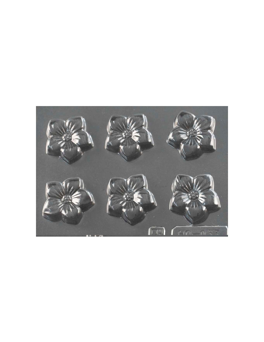 Molde de PVC ARHO090 para pastillaje con chocolate Flores. 8 cavidades. 3 medidas distintas: 40 x 40 x 5 mm / 30 x 30 x 5 mm / 25 x 25 x 5 mm.
