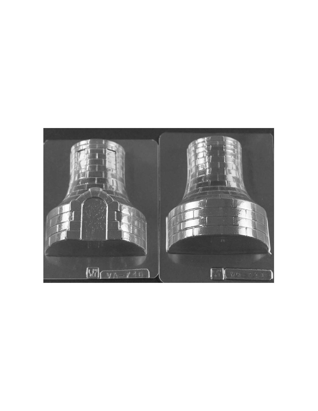 Molde de PVC termoformado ARVA740 Base de torre de castillo con puerta. Medidas: 110 x 95 x 85 mm. 2 cavidades. 1 molde doble. Producción: 1 figura.