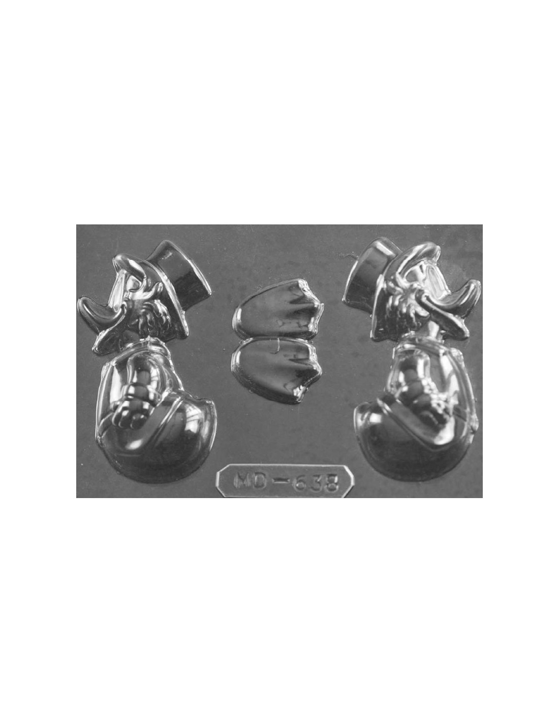 Molde de pvc para figura de chocolate 3D Pato con sombrero de copa. Medidas: 90 mm x 44 mm. Molde doble. 4 cavidades. Producción: 1 figura.