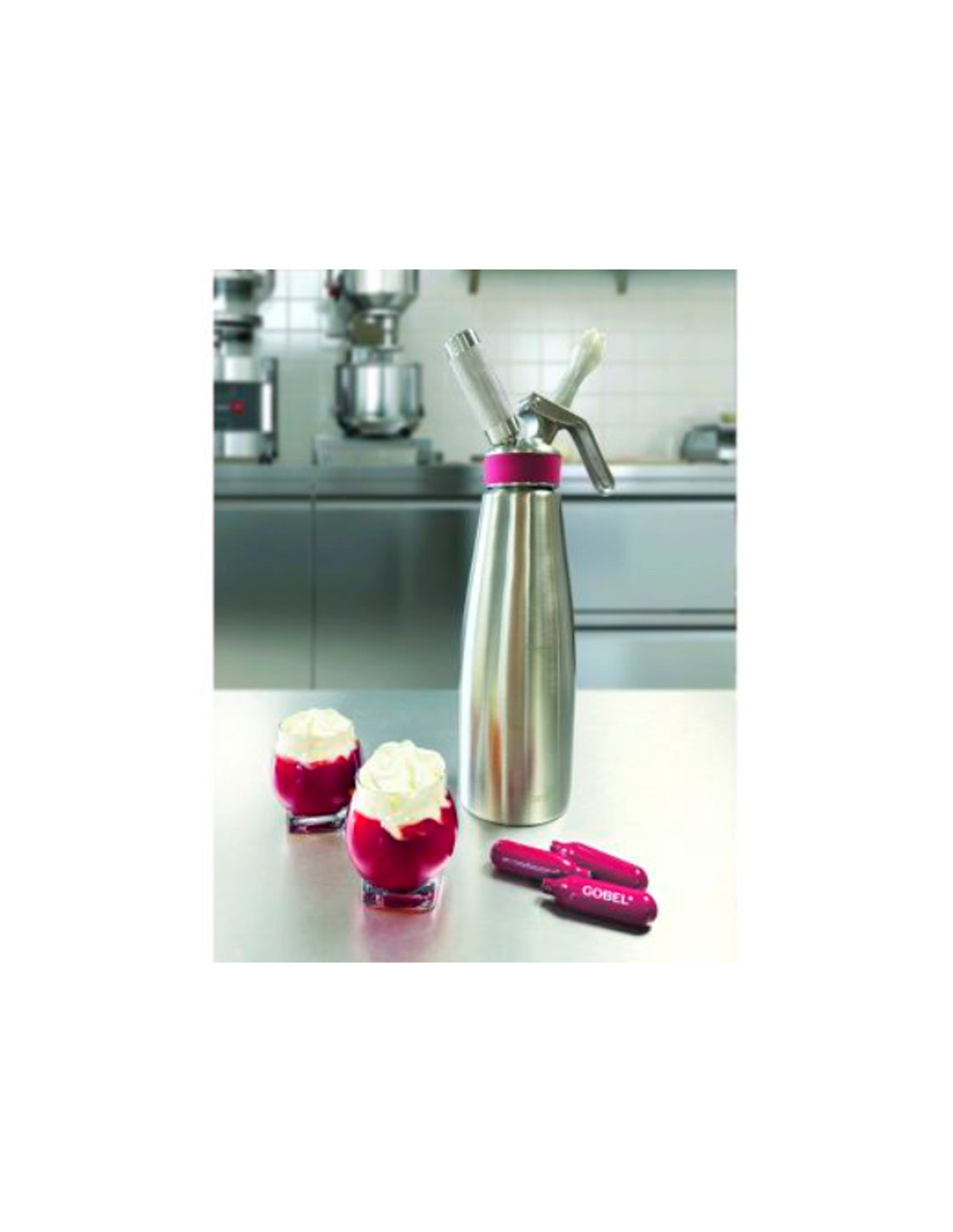 Sifón profesional Gobel de 1 litro en acero inoxidable, ideal para espumas, cremas y mousses. Robusto, seguro y apto para preparaciones frías y calientes.