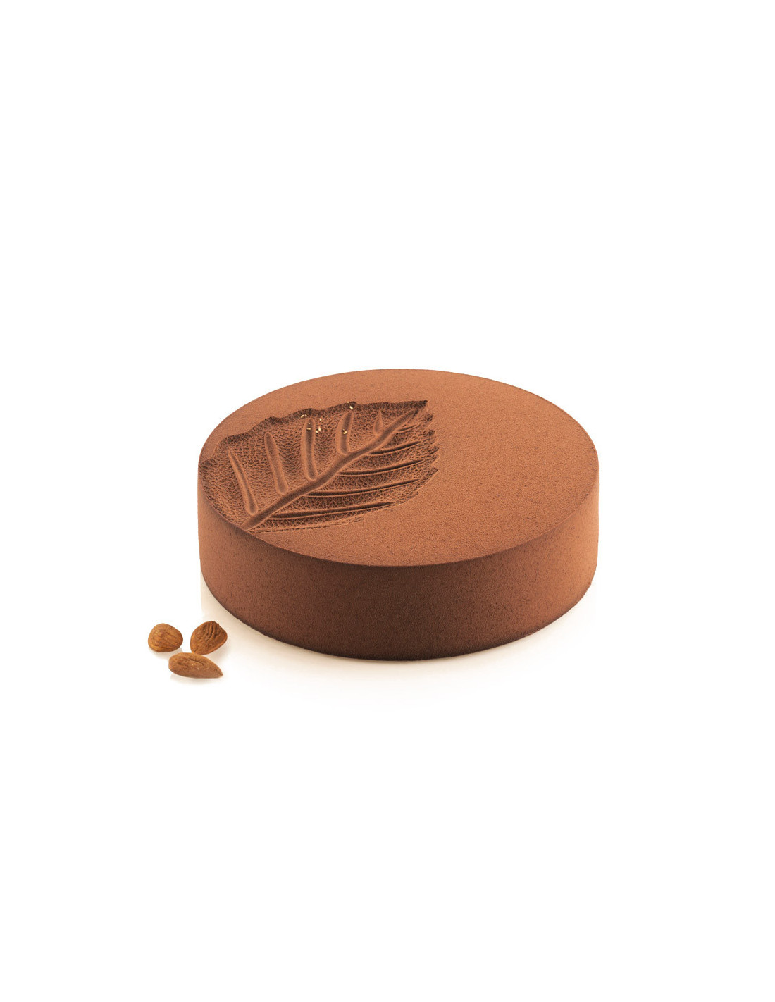 El kit consta de un molde de silicona y un tapete de silicona que se coloca dentro del molde para crear un entremet con decoración de una hoja. Diseñado por el chef Franscisco Moreira.
