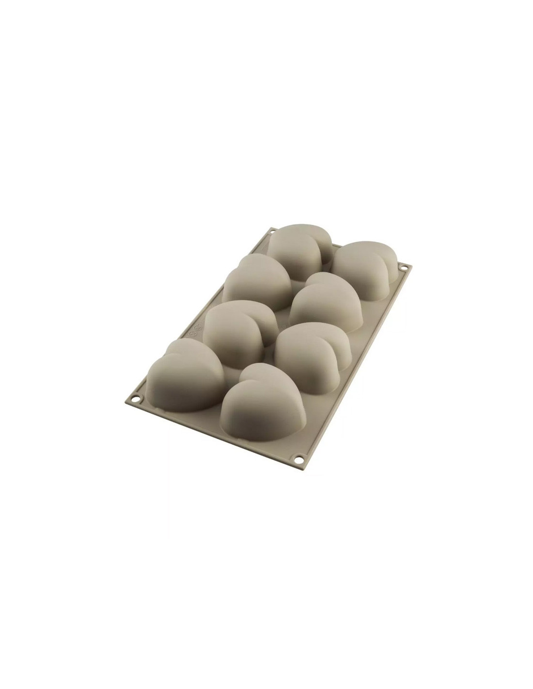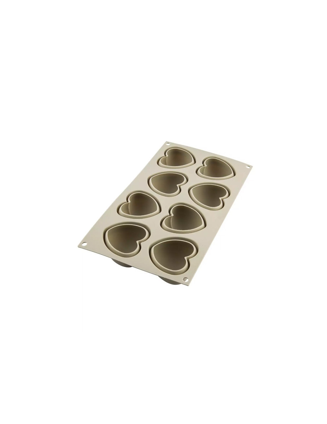 Molde de silicona con 8 cavidades en forma de corazón, cada una de 100 ml aprox. Dimensiones por cavidad: 63 x 65 x h38 mm. Ideal para postres románticos y presentaciones creativas.