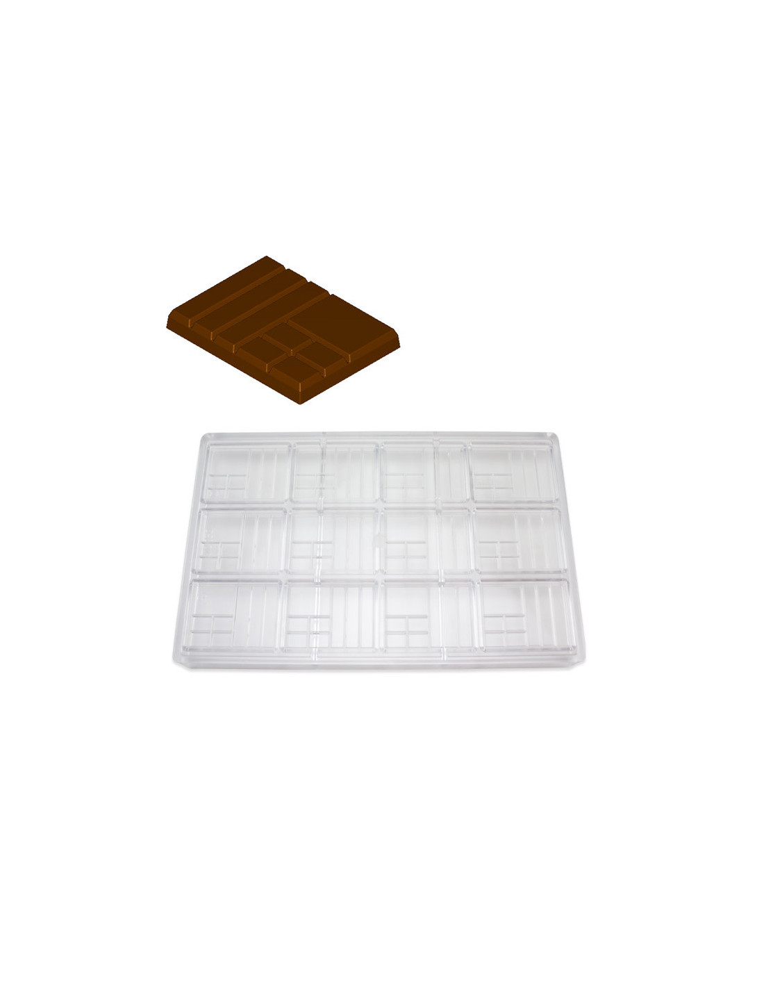 Molde de policarbonato MA2006 para snack de chocolate. Medidas: 50 x 26 x h3 mm. 16 cavidades.