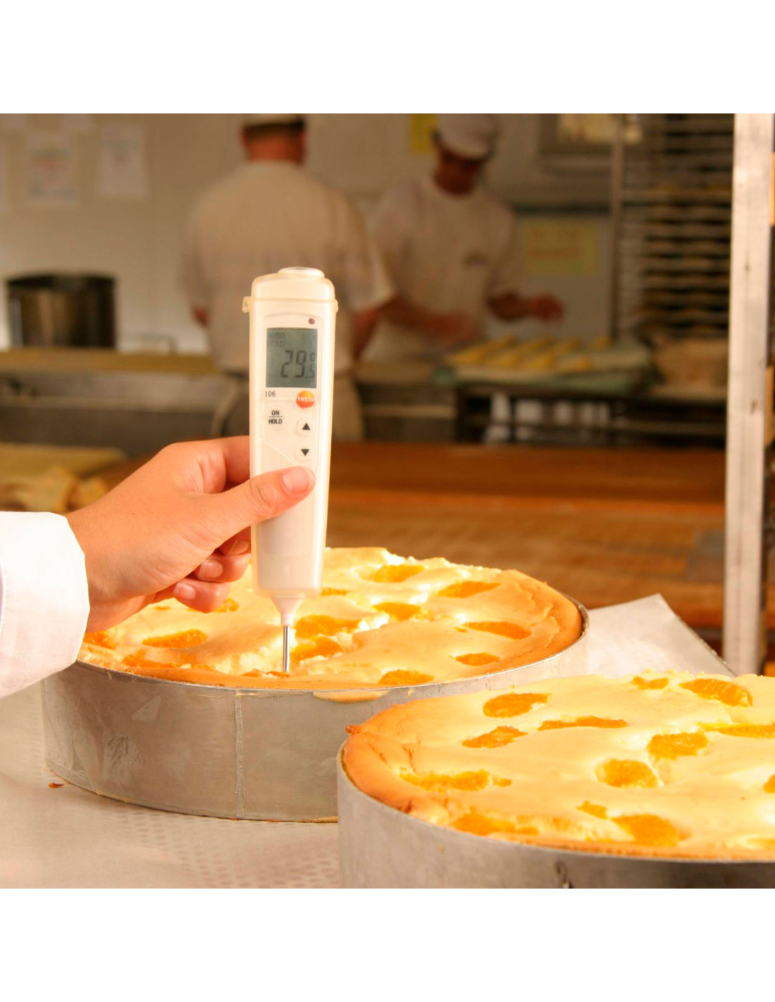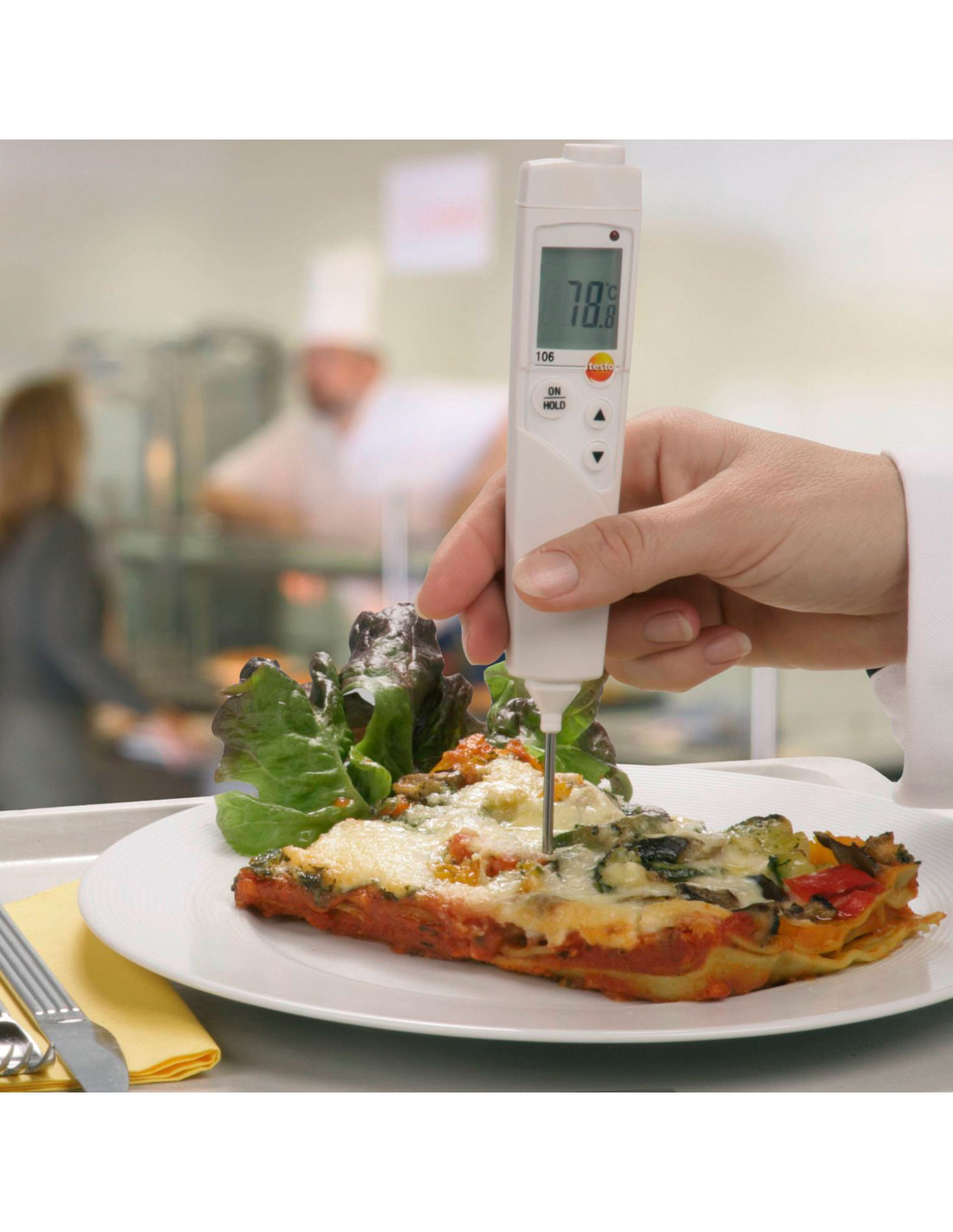 Práctico para una medición de temperatura rápida y fiable en los controles de alimentos: con el compacto y práctico termómetro de uso alimentario testo 106, estará perfectamente equipado para medir la temperatura interior de los alimentos en cocinas industriales, restaurantes, supermercados y durante el servicio de comidas en cáterings.
