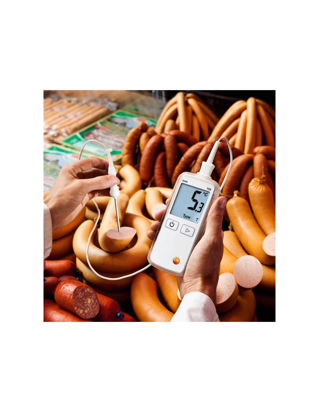 Para la realización de mediciones de comprobación puntuales con resultados precisos en cuestión de segundos: el termómetro testo 108 es el instrumento ideal para medir durante la producción, el procesamiento y el almacenamiento de alimentos.