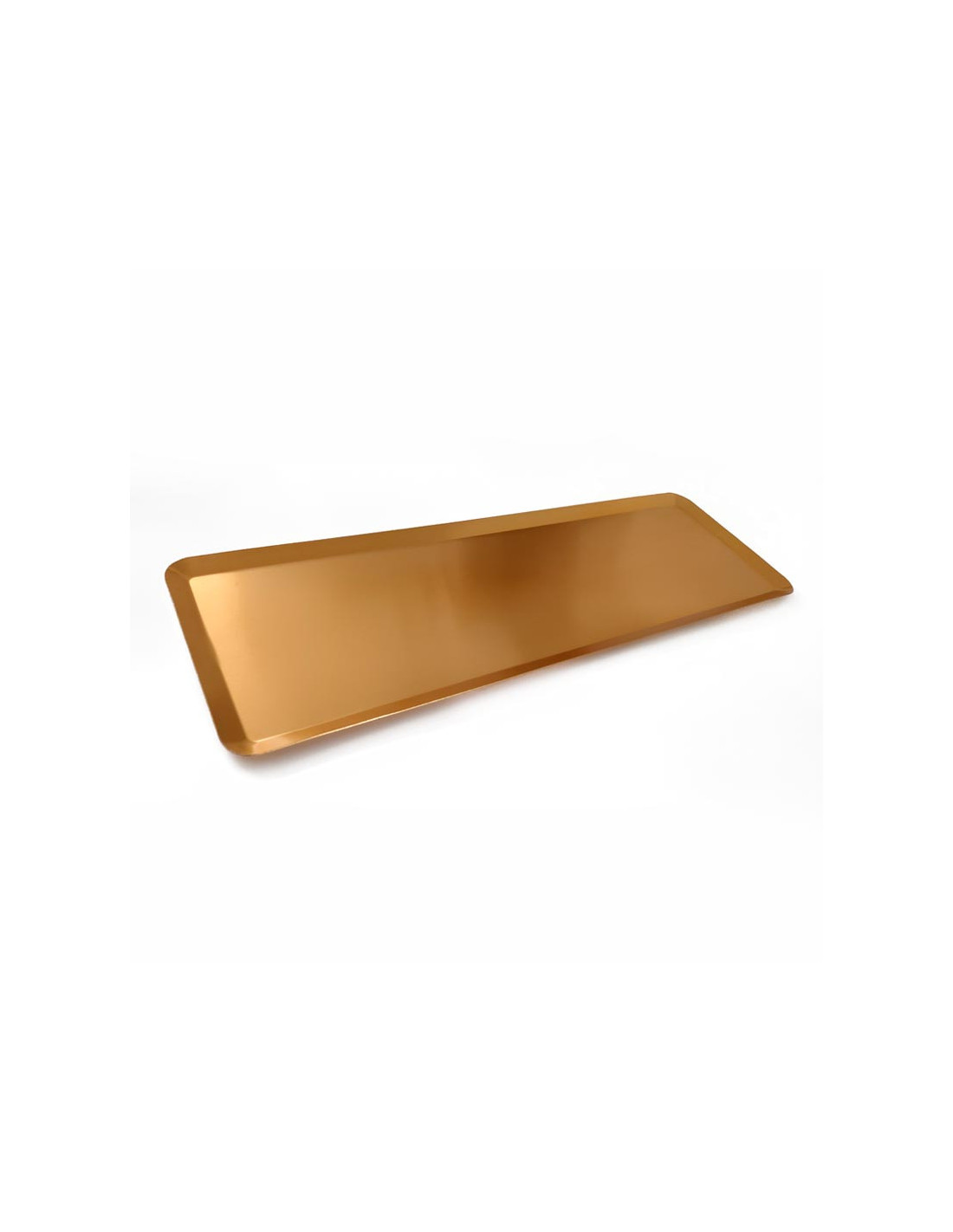Bandeja Cónica Anonizada de aluminio color oro. Medidas: 600 x 200 x 10 cm. Espesor: 1,2 mm. Ideal para presentación de productos de pastelería y repostería.