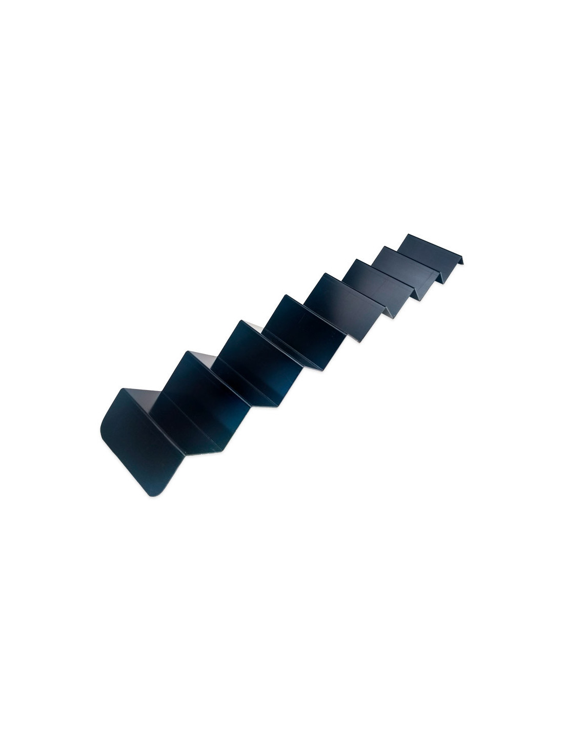 Expositor Zig Zag de aluminio negro mate. Medidas: 58 x 17 x 3,5 cm. Espesor: 1,2 mm. Ideal para presentación de productos de pastelería y repostería.