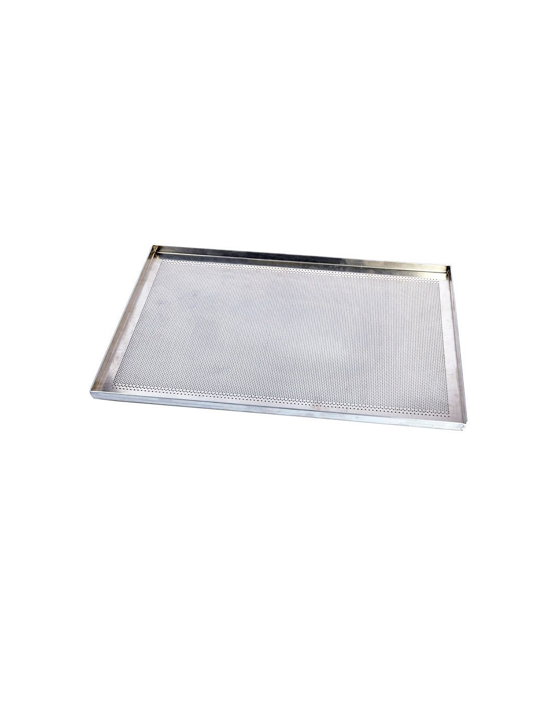 Bandeja de aluminio perforada con 4 lados, fabricada en espesor 12/10 y perforación de Ø2,5 mm. Medidas: 600 x 400 x 20 mm.
