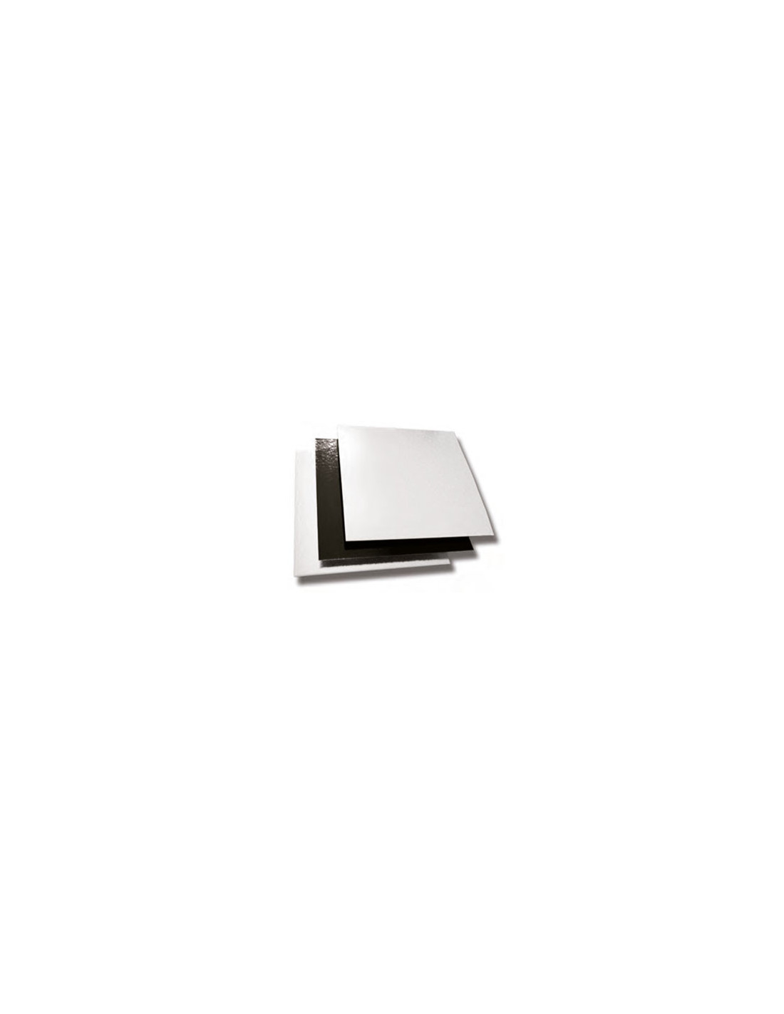 Base cuadrada de cartón rígido 16x16 cm en blanco y negro. Ideal para presentar tartas y pasteles. Pack de 50 unidades.
