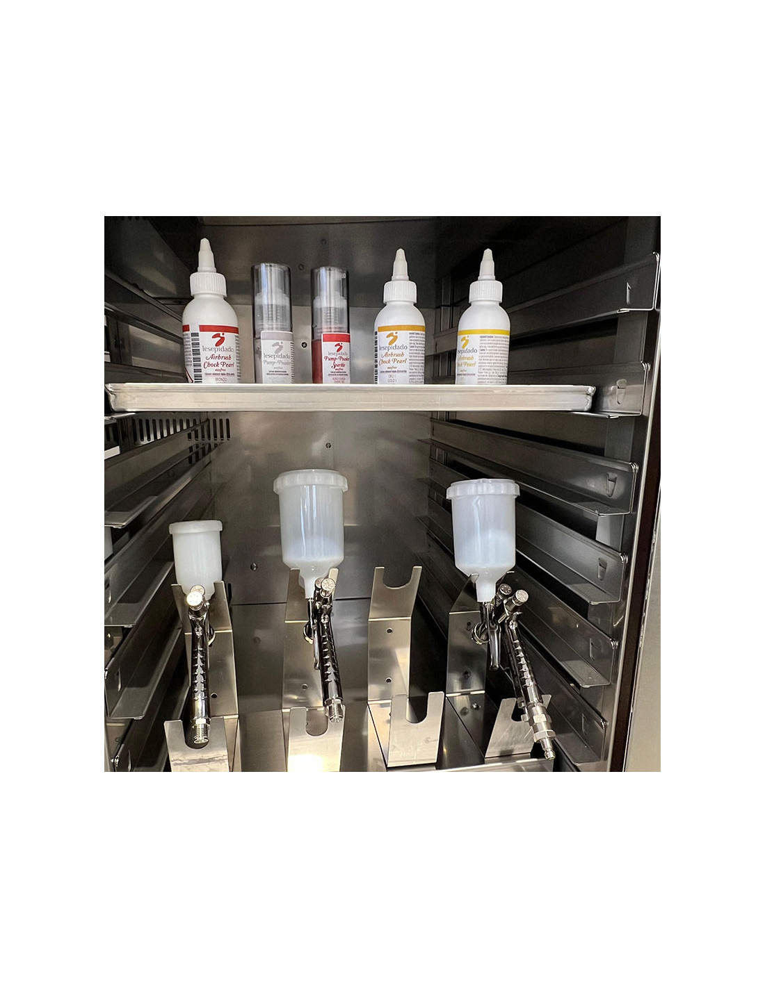 Permite mantener utensilios, pistolas de pulverización y productos alimentarios a temperatura de trabajo, optimizando las condiciones durante el proceso de decoración.