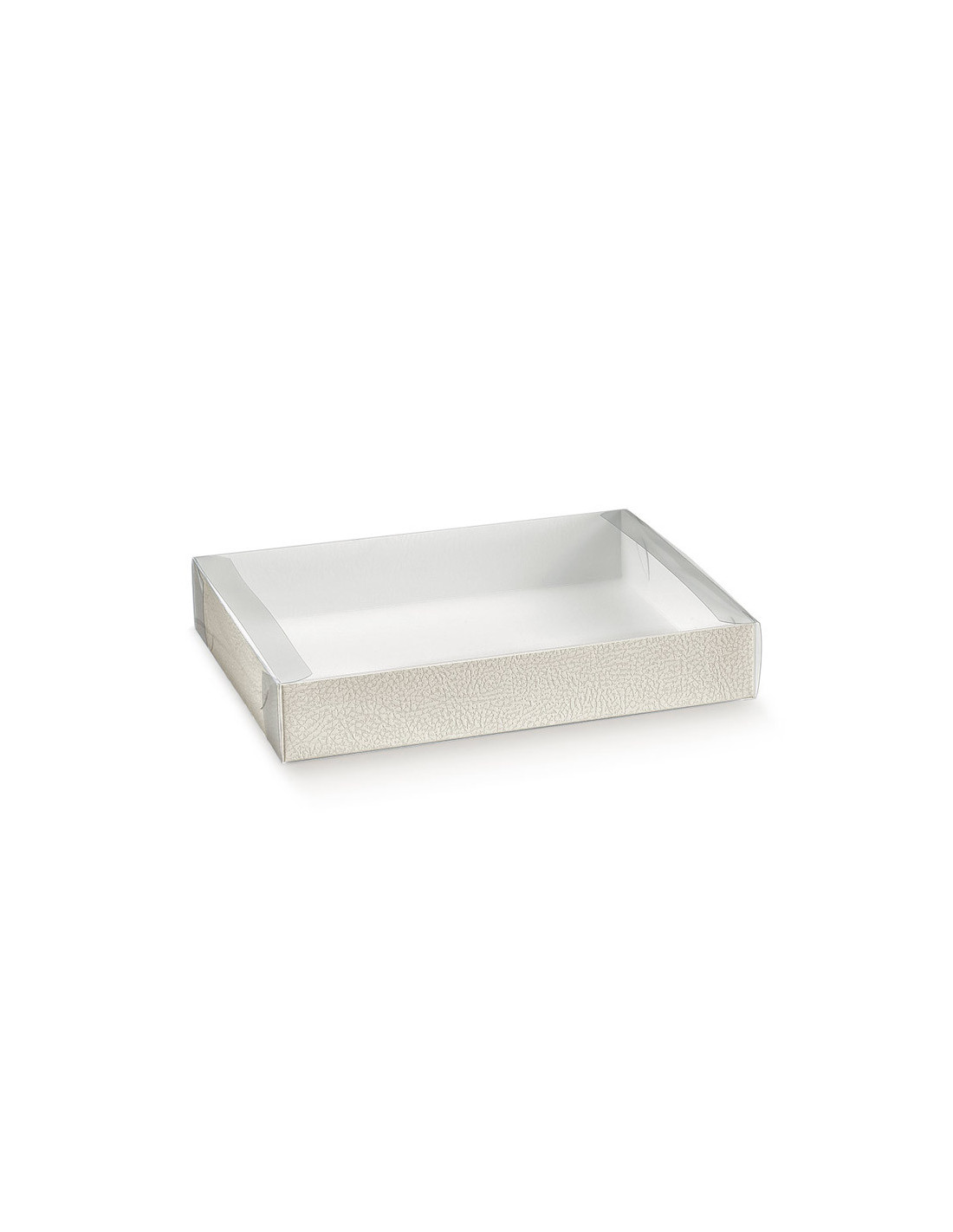 Estuche de cartón Piel Blanca con forro de PVC transparente. Medidas: 225 x 175 x 40 mm. Pack de 10 unidades.