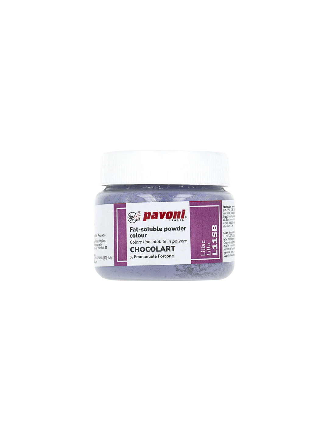Colorante alimentario liposoluble en polvo para pastelería y repostería, de Pavoni. Color: Lila. Idóneo para colorear masas grasas como el chocolate o la manteca de cacao. Volumen: 40 gramos.