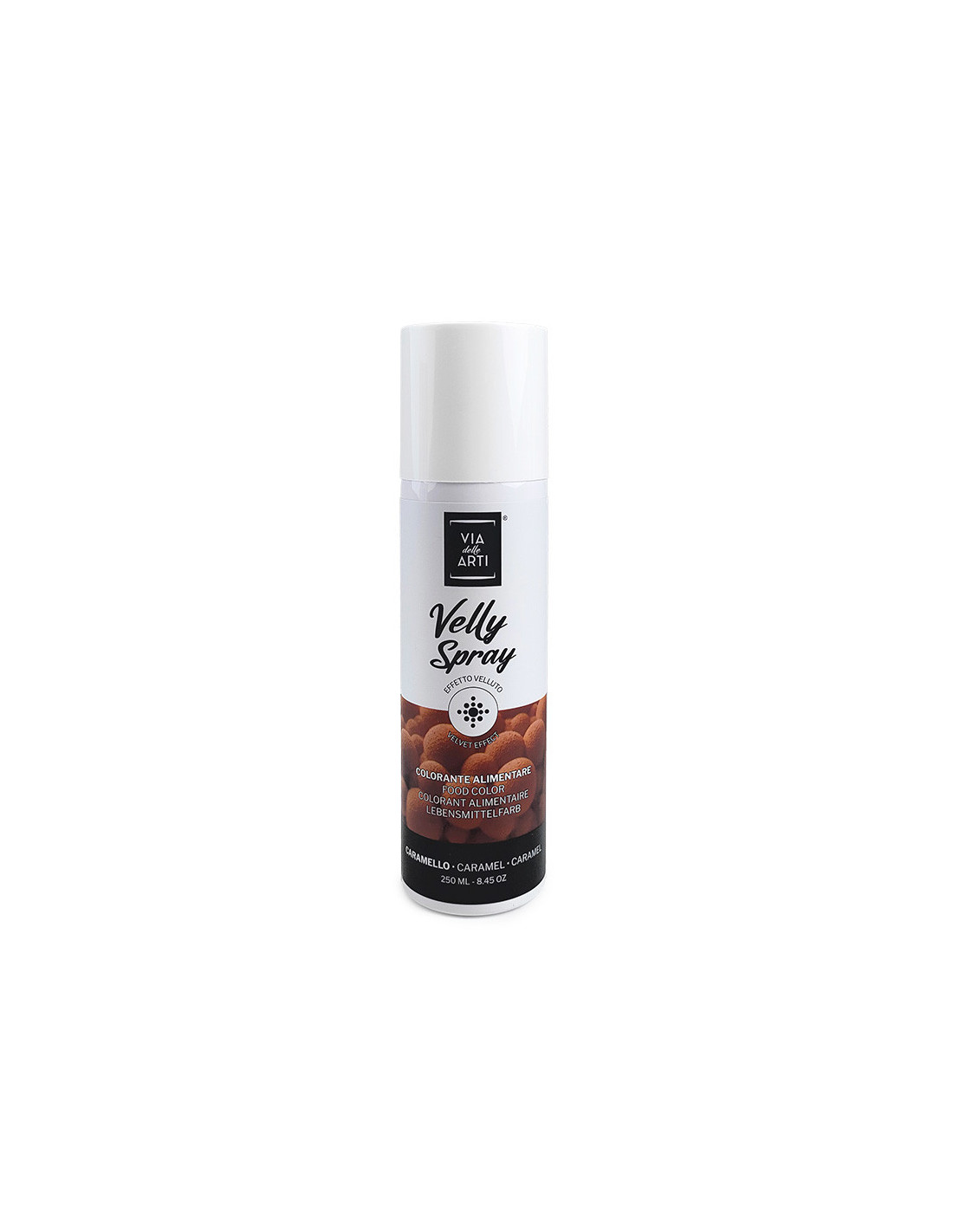 Colorante en spray efecto terciopelo con base de manteca de cacao de la colección Dolce Velluto de Pavoni. Color Amarillo. Preparado listo para colorear sobre chocolate y en productos de pastelería y repostería. Capacidad: 400 ml.