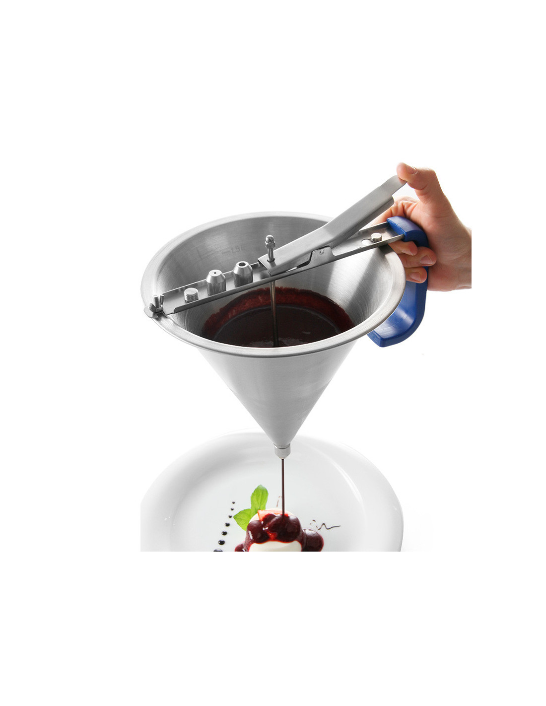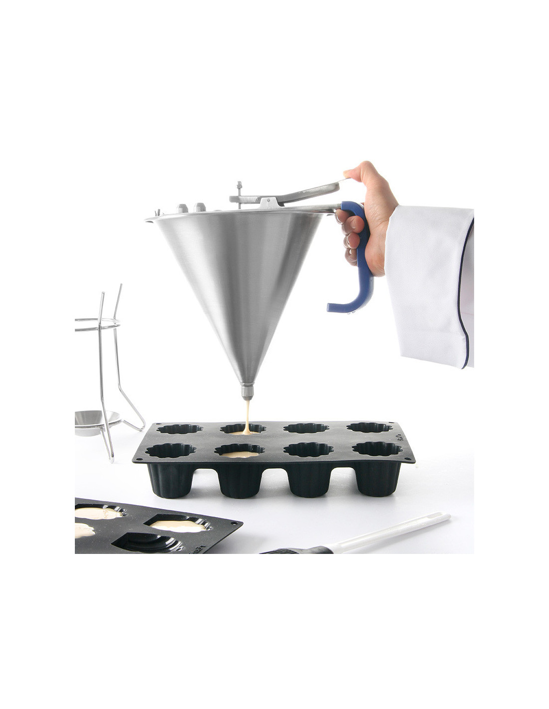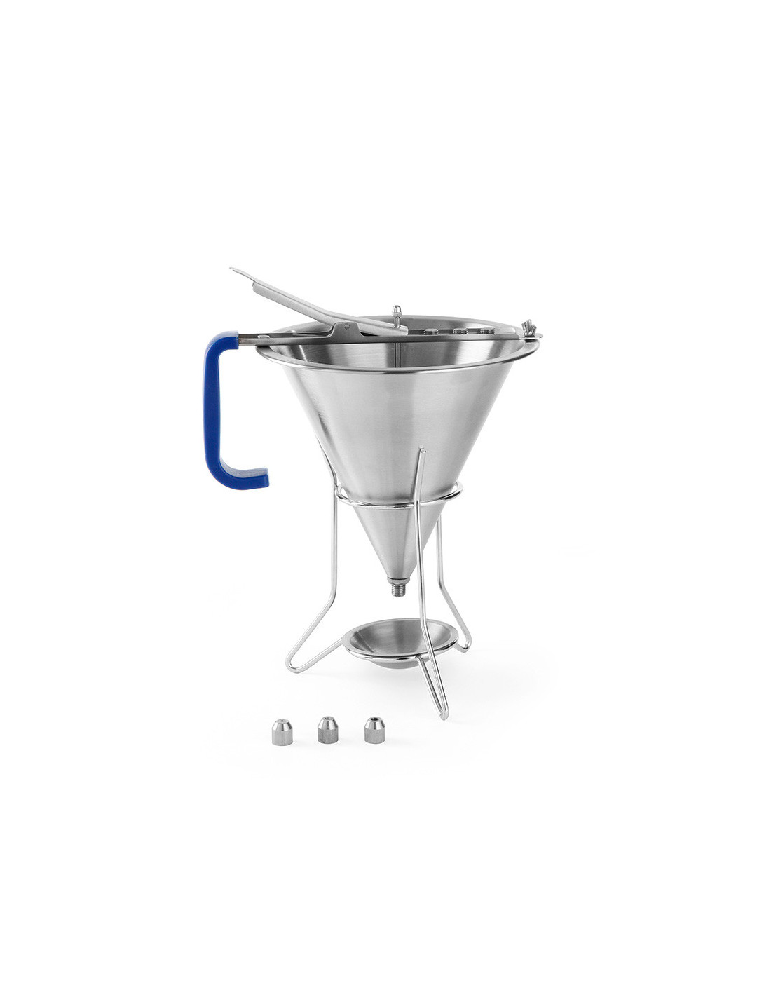 Soporte de acero inoxidable para embudos automáticos.