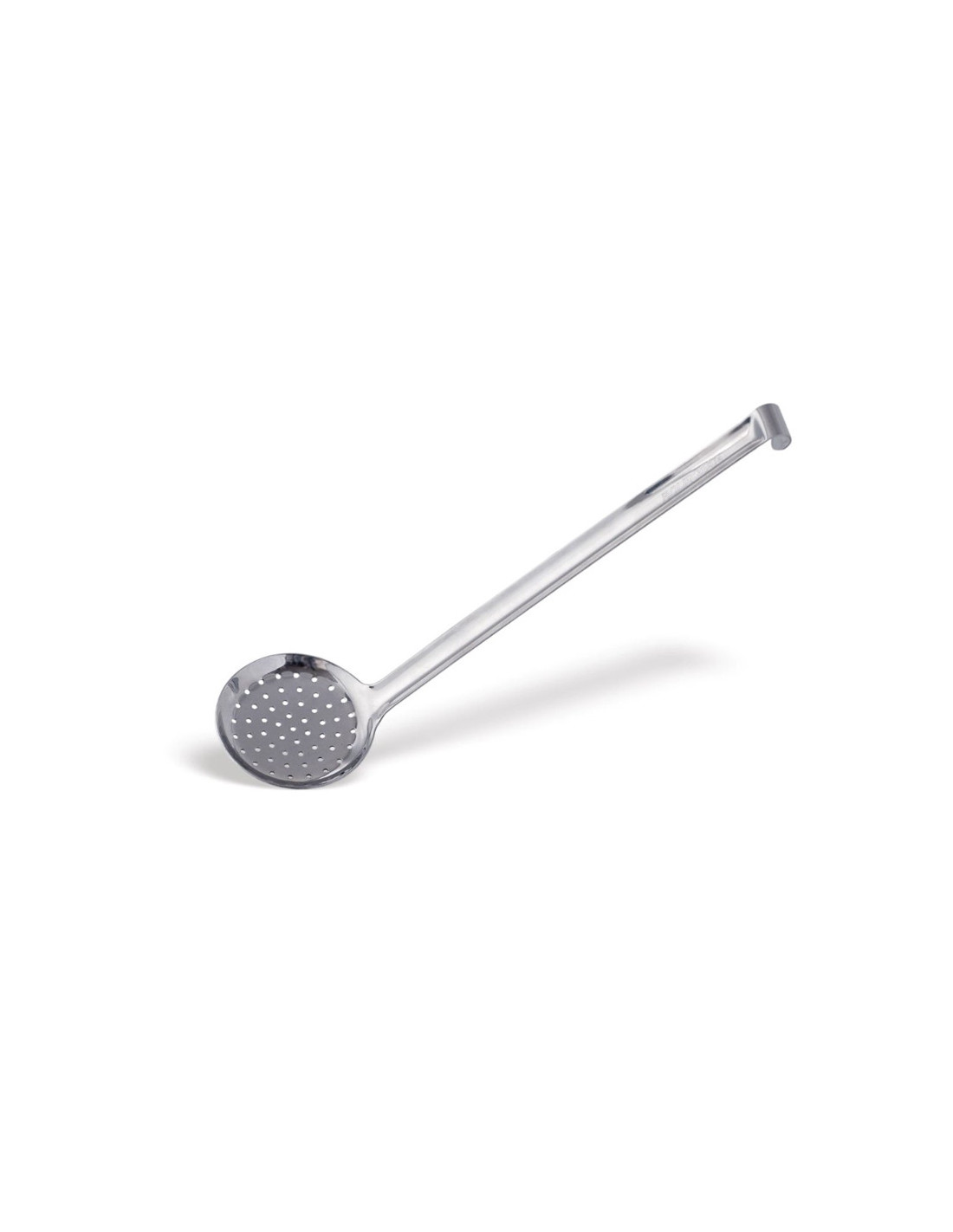 Su diseño monobloc (una sola pieza) garantiza mayor solidez y evita puntos de acumulación de suciedad, facilitando la limpieza. El cabezal de 12 cm de diámetro permite retirar espuma, escurrir alimentos o manipular frituras con comodidad, mientras que su longitud de 45 cm proporciona una distancia segura frente al calor..