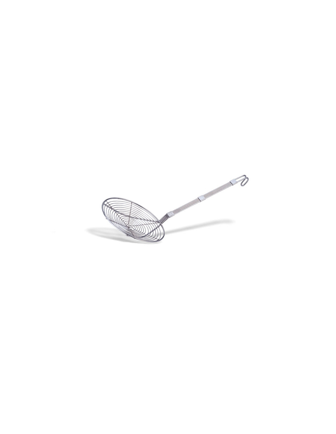 Espumadera monobloc económica, fabricada en acero inoxidable, con diámetro de 12 cm y longitud total de 45 cm.