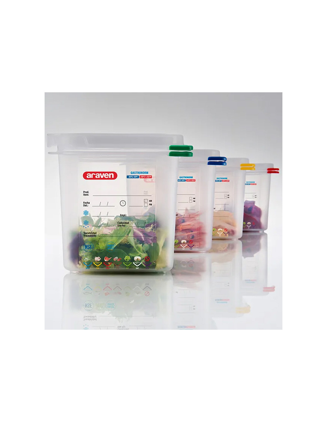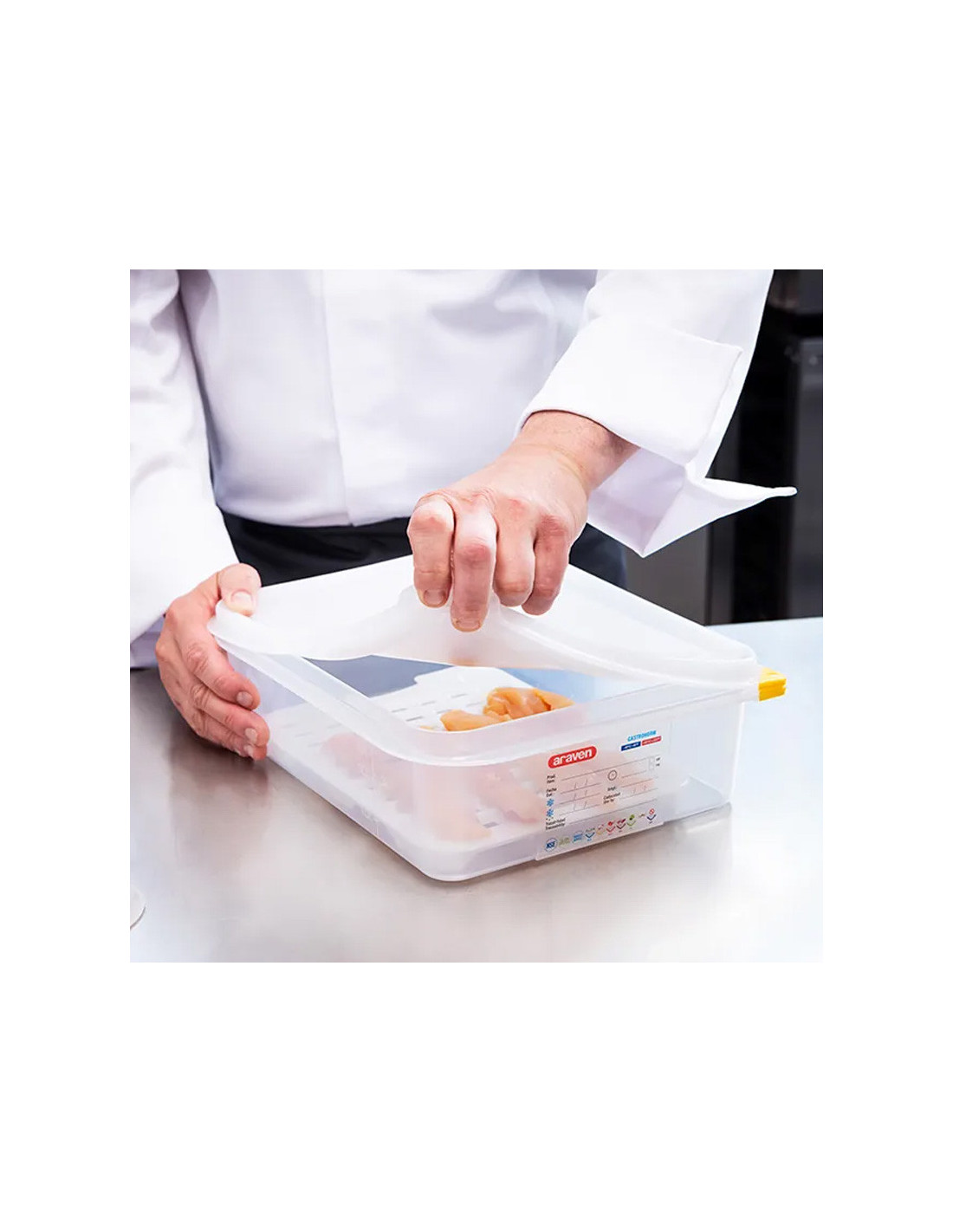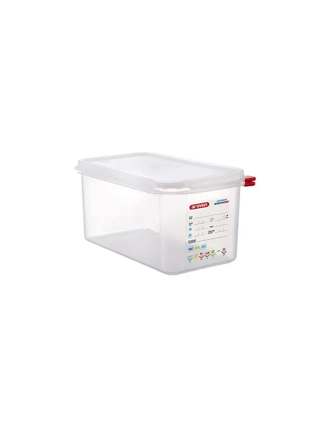 Contenedor translúcido hermético GastroNorm 1/1 de 200mm de alto y capacidad para 27,5 litros.