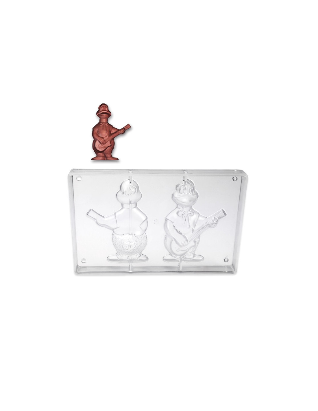 Molde de policarbonato con 2 cavidades que forman un pato grande y 6 cavidades que forman un pato pequeño. Ideal para figuras de chocolate con alto detalle.