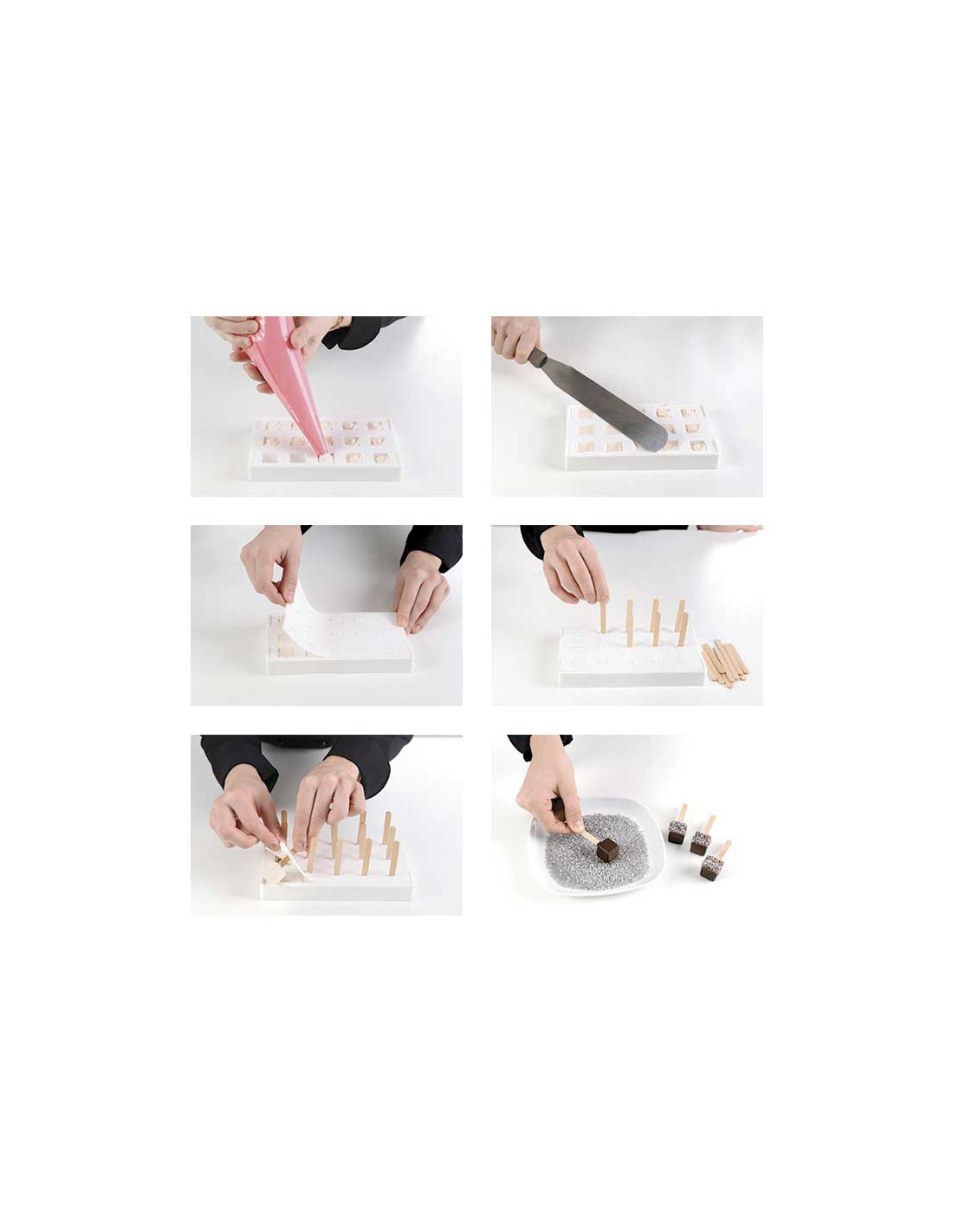 Molde Stecco Flex Gel 06 Pata. El kit se compone de: 2 moldes de silicona + 50 sticks de madera + bandeja de 30 x 40 cm. Dimensiones: 89 x 84h x 24 mm. Volumen: 98 ml.